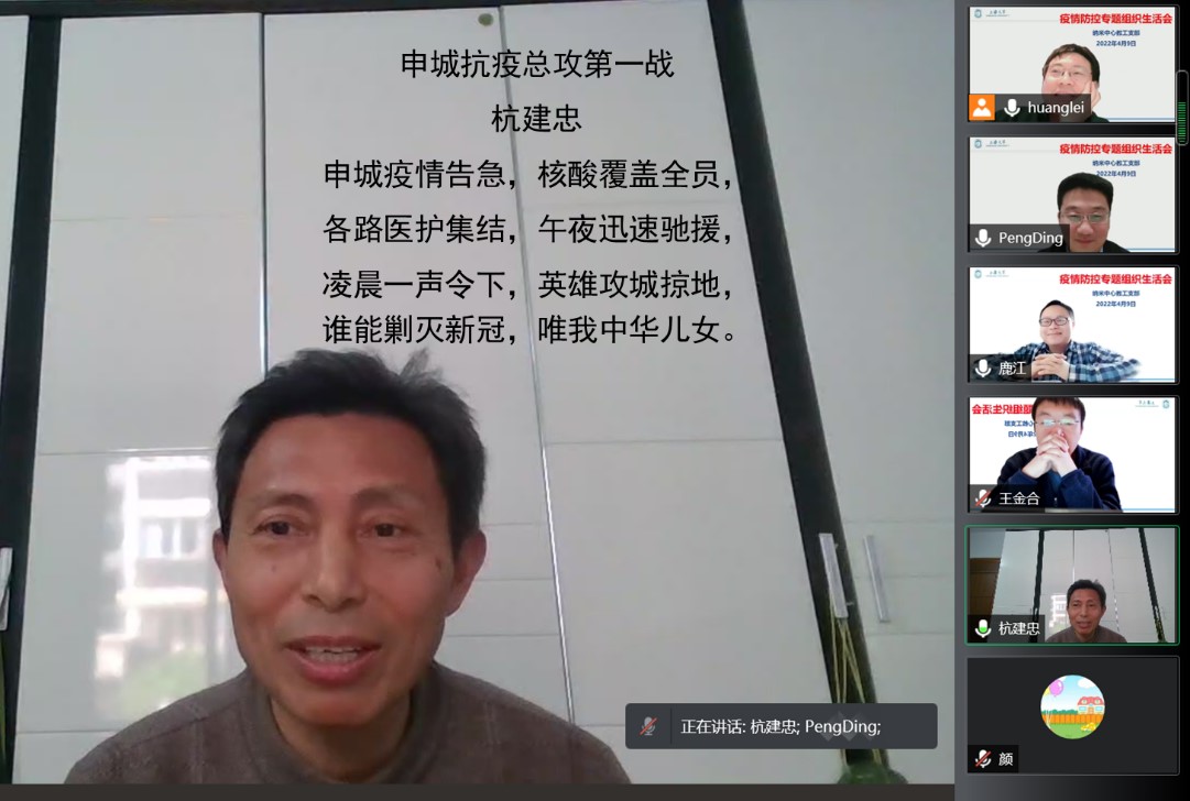杭建忠老师激情澎湃朗诵了疫情期间所做的小诗,在艰难时刻更加凸显了乐观的心态和抗疫必胜的决心,获得了热烈掌声。袁帅老师则通过视频连线的方式让大家在线感受了校园的宁静,希望大家能早日回到校园开展工作。张剑平老师疫情以来一直坚守在学校,介绍了纳米中心实验室情况,让大家放心、安心。孙丽宁老师讲述了疫情的不容易,希望大家都能做好防护、平安顺利。