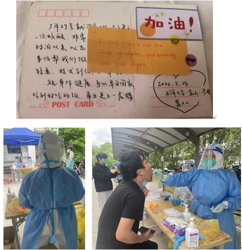 5月16日,雷老师开始单独上岗核酸采样。手部消毒,取出棉签,擦拭采样等,她动作娴熟地为师生提供采样。一天上午,她采样了716人,服务时长3个半小时,中途不喝水、不去卫生间,遇到高温天,她的头发衣衫尽湿。虽然手臂很酸,但她心里不觉得疲惫。采样时,为了防止蒸汽模糊眼罩,她很少说话,基本都是用眼手示意。师生们虽不知她的姓名,却感受到面罩后温柔坚定的目光。学生一声声地“谢谢老师,老师好温柔”,微信群里师生们向她致敬、为她点赞。5月28日,一位女同学给她送上感恩卡片,卡片里写满了感谢和祝福,让她觉得心里无比温暖,更感到师生们的重托和沉甸甸的责任。6月初,她仍然每天奋战在采样一线,是目前校内核酸采样7人志愿者队伍的中流砥柱。除了完成固定采样工作,她还随时听从工作安排去不同点位支援采样。
