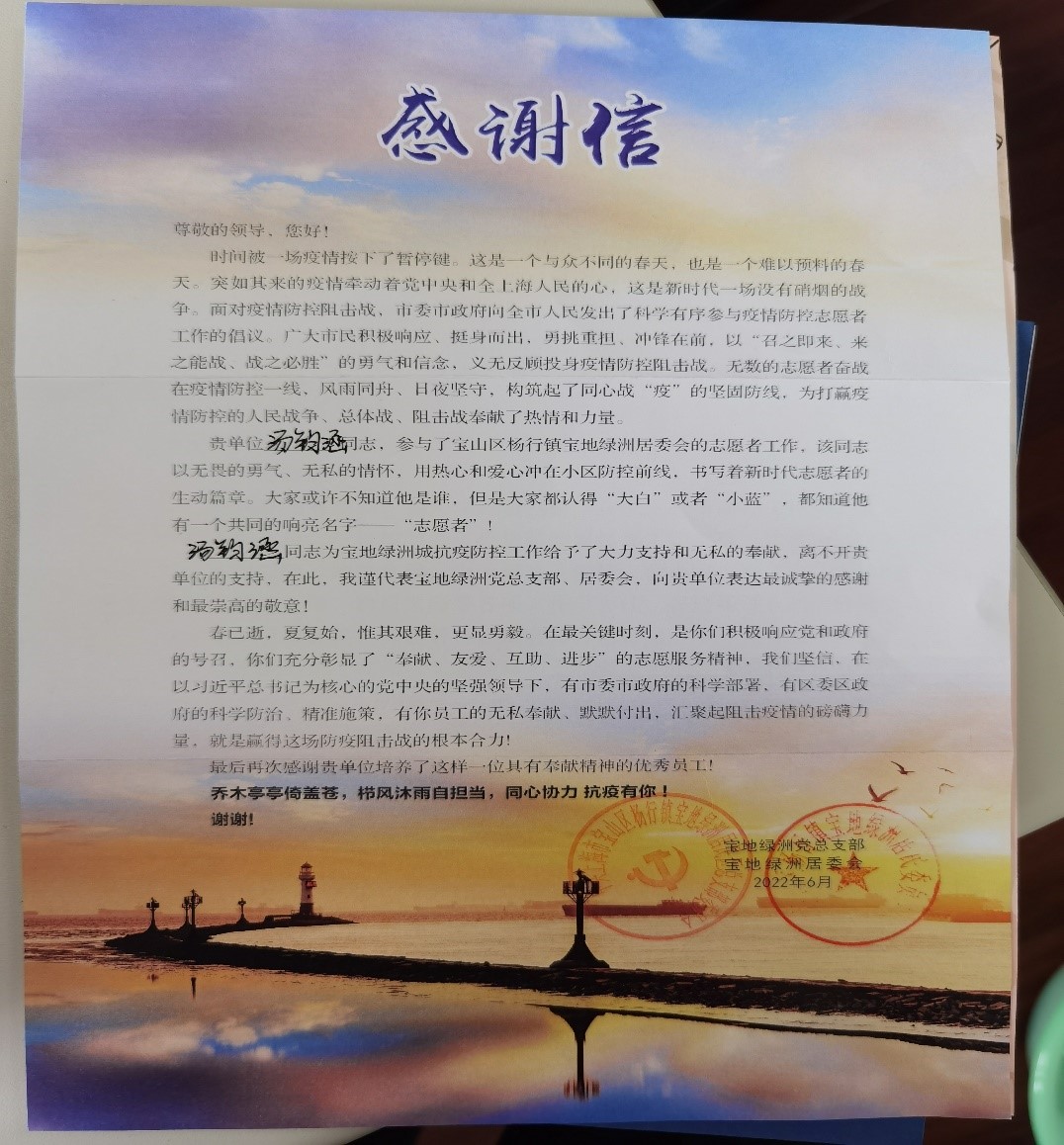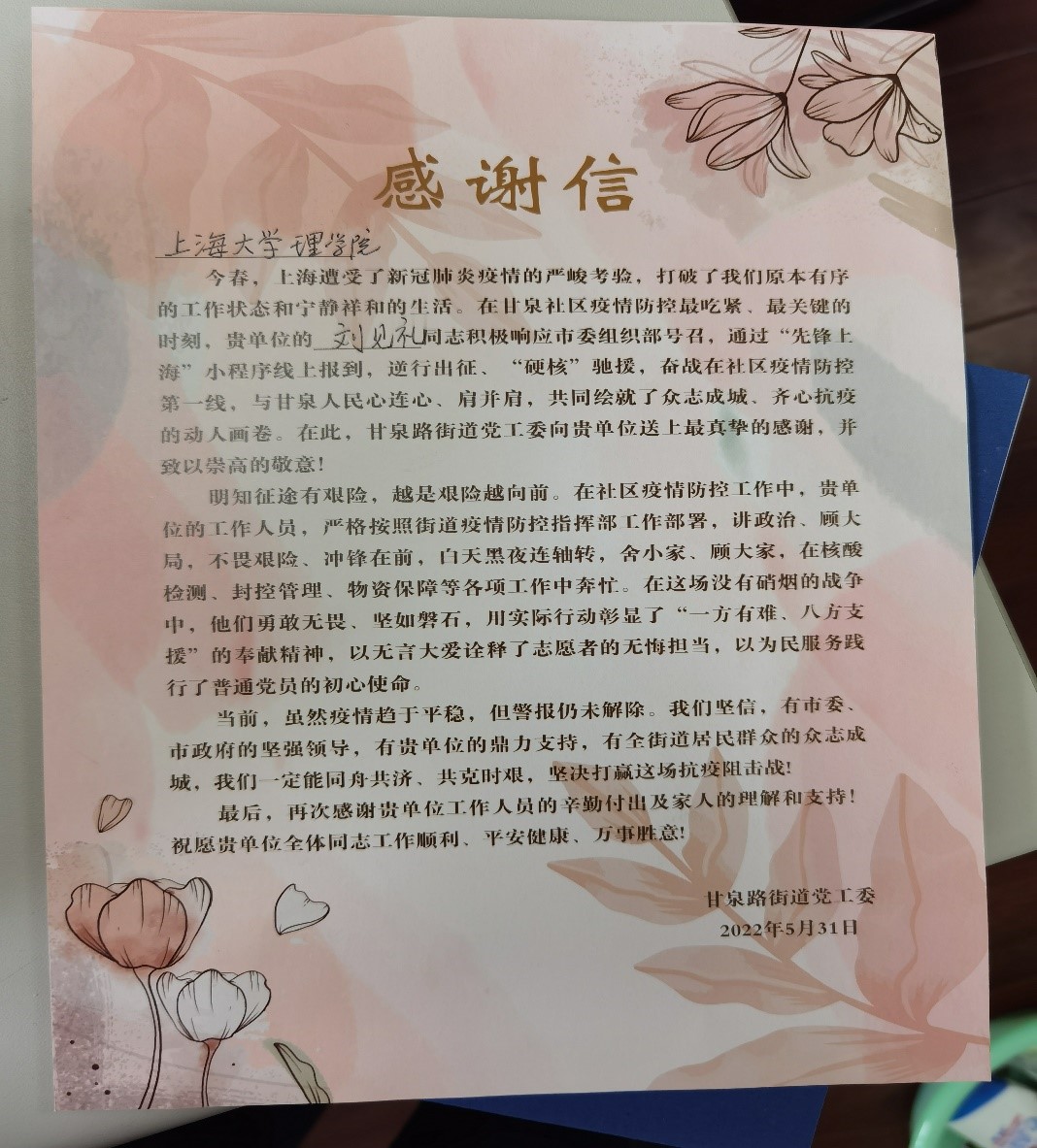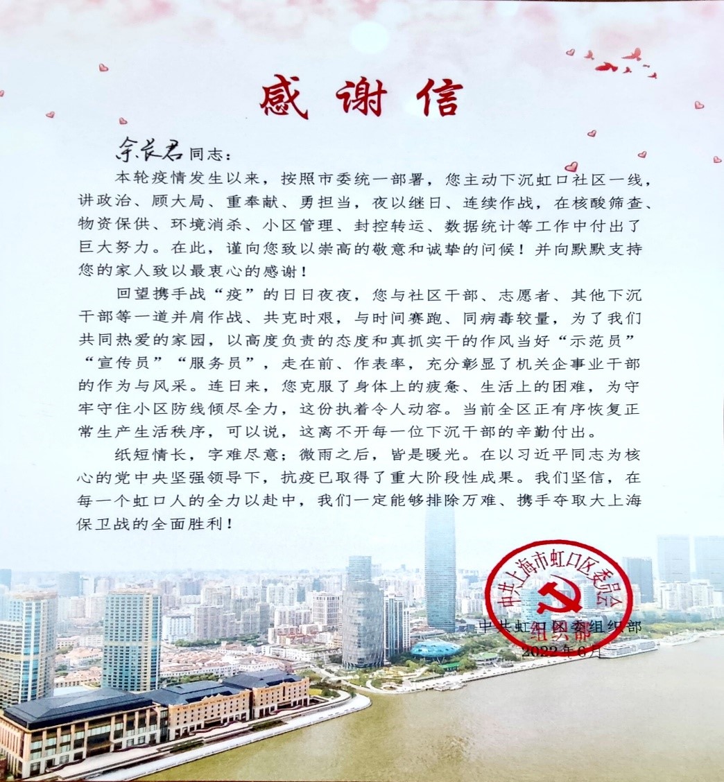上海疫情面临严峻考验之际,365英国上市集团各级党组织和党员同志闻令而动、召之即来,积极响应市委组织部号召,在“先锋上海”小程序线上报到,连续奋战在属地社区抗议一线,积极协助居委承担核酸筛查、生活保障等志愿服务工作,充分彰显了365英国上市集团党员识大局、明责任、讲担当、肯付出的精神品质。对于疫情期间的无私奉献,学院多位党员诸如刘见礼、余长君、汤钧涵等同志也收到了来自属地政府部门的感谢信。