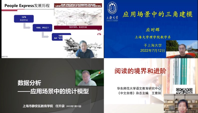 7月12日第二天,复旦大学徐以汎老师的《应用场景中的数学技术--收益管理浅析》,课程阐述了供应链风险管理和管理收益中的一些基本模型,并结合酒店超订、航空公司的定价和收益说明了数学技术的重要作用,此外在与同学们的交流中,他的回答认真而又细致,同学们受益匪浅。随后英国365公司应时辉教授的《应用场景中的三角建模》,以三角付里叶函数的为视角向学生们介绍了人工智能的发展历史和前沿的研究方向及AI核心算法和优化建模,以图像处理为例讲述了人工智能的基本原理。学生们对诸如深度学习、神经网络、机器学习等热门词汇表现出浓厚的兴趣。静安区教育学院正高级特级教师任升录教授的《应用场景中的统计建模》从问题驱动出发,给学生们介绍了数据分析的路径和方法,并结合咸潮问题启发学生们如何分析和看待问题。随后华东师范大学中文自修主编王意如教授的《阅读的境界和进阶》告诉了学生们语文阅读和数学一样也是一种创造性的活动,阅读的高层次是重在理解。王老师的讲座深入浅出,逻辑清晰,在与同学们的交流中,她的回答认真而又细致,同学们受益匪浅。