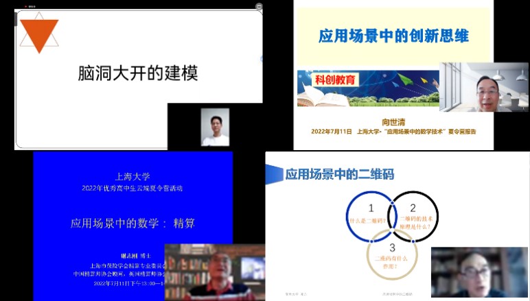 7月11日第一天的夏令营,学生们纷纷表示活动让他们耳目一新,杨静桦老师的《脑洞大开的数学应用》:通过追问和建模的各类假设引发学生们探索发现,并纠正学生们在数学认知中的一些错误;使学生们明确只有掌握数学建模的核心思想才能做出合乎实际的建模选择,从而培养了学生们碰到问题要锲而不舍地思考和研究!中国科学院光机所向世清教授的《应用场景中的创新思维》,用浅显和幽默的语言向学生们讲解了创新创意,并通过介绍逐年创新发展机器人在各种先进领域的应用,鼓励学生从生活中发现问题,用创新思维解决问题,打开了学生们的创新思维。上海财经大学谢志刚教授的《应用场景中的数学:精算》介绍了数学在金融经济、工程管理以及社会科学等领域的应用,激发学生在生活中寻找问题。并与同学交流互动,解答了学生在数学方面的困惑。学生的提问涉及保险精算、人工智能、数理统计等前沿领域,本次活动在同学们热烈的交流中圆满结束。复旦大学凌力教授的《应用场景中的二维码》,从“扫一扫”阐述了二维码实现的理论基础,强调了数学中的密码与编码,统计等在二维码技术中的核心作用。