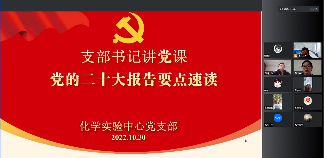 把党的二十大精神学习好、宣传好、贯彻好,是当前和今后一个时期的首要政治任务。近日,化学学科党总支的7个党支部组织开展线上、线下多种形式的专题组织生活会,全体党员积极参与,认真学习了党的二十大报告,交流了学习体会。
