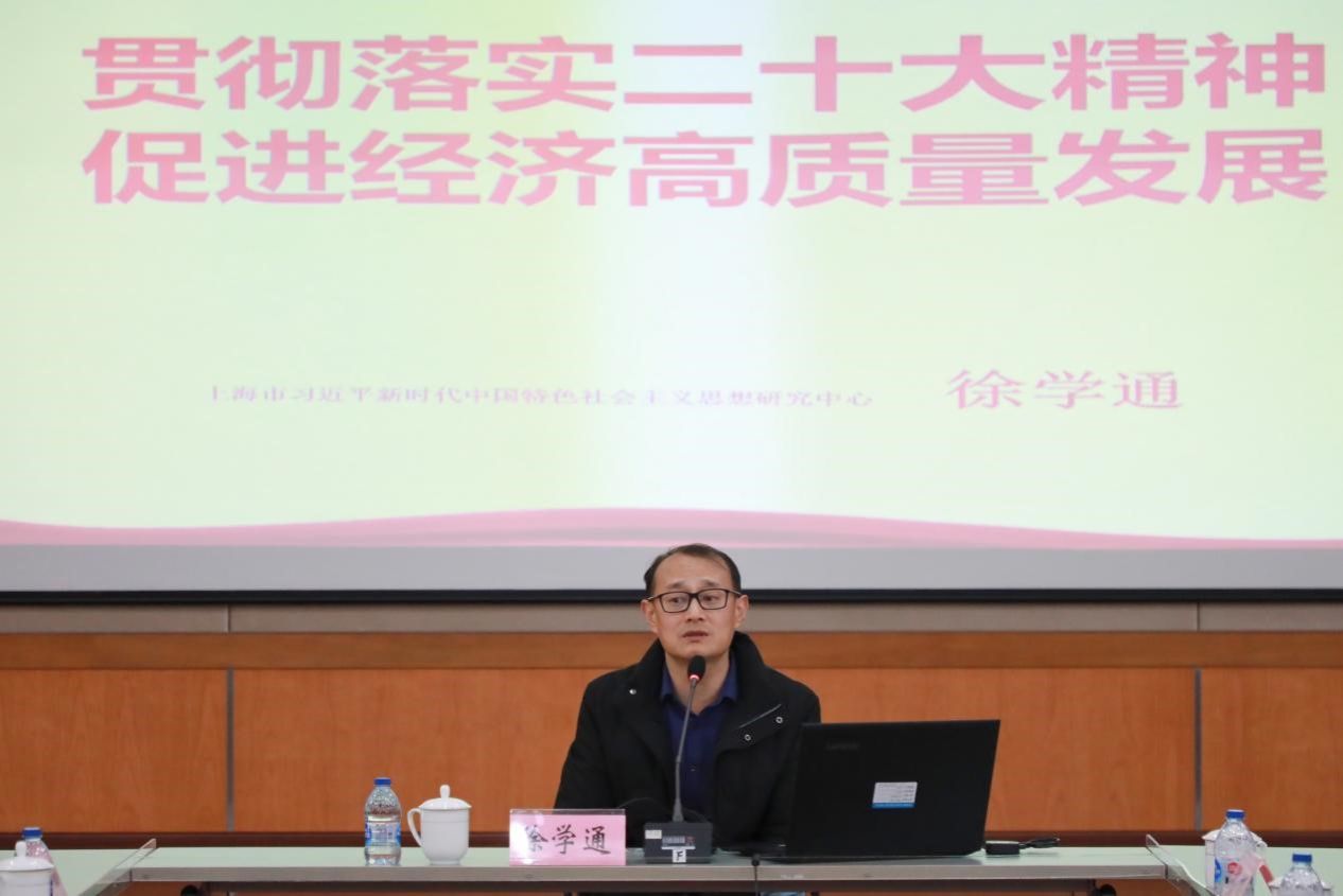 为深刻领悟党的二十大精神的精髓要义和实践要求,本次会议特邀上海市委党校(上海行政学院)党史党建教研部政党研究所教授徐学通作“贯彻落实二十大精神、促进经济高质量发展”专题辅导讲座。旗帜决定方向,徐教授从高举中国特色社会主义的伟大旗帜讲起,结合我国2035年和2050年奋斗目标,描绘了中国式现代化的美好蓝图,并从教育、科技、人才、经济、农业、产业转型升级等多方面、多维度地诠释了高质量发展的首要任务、必由之路等,使得以高质量发展推动社会主义现代化的实践路线图更加清晰、易懂,启迪智慧,催人奋进。