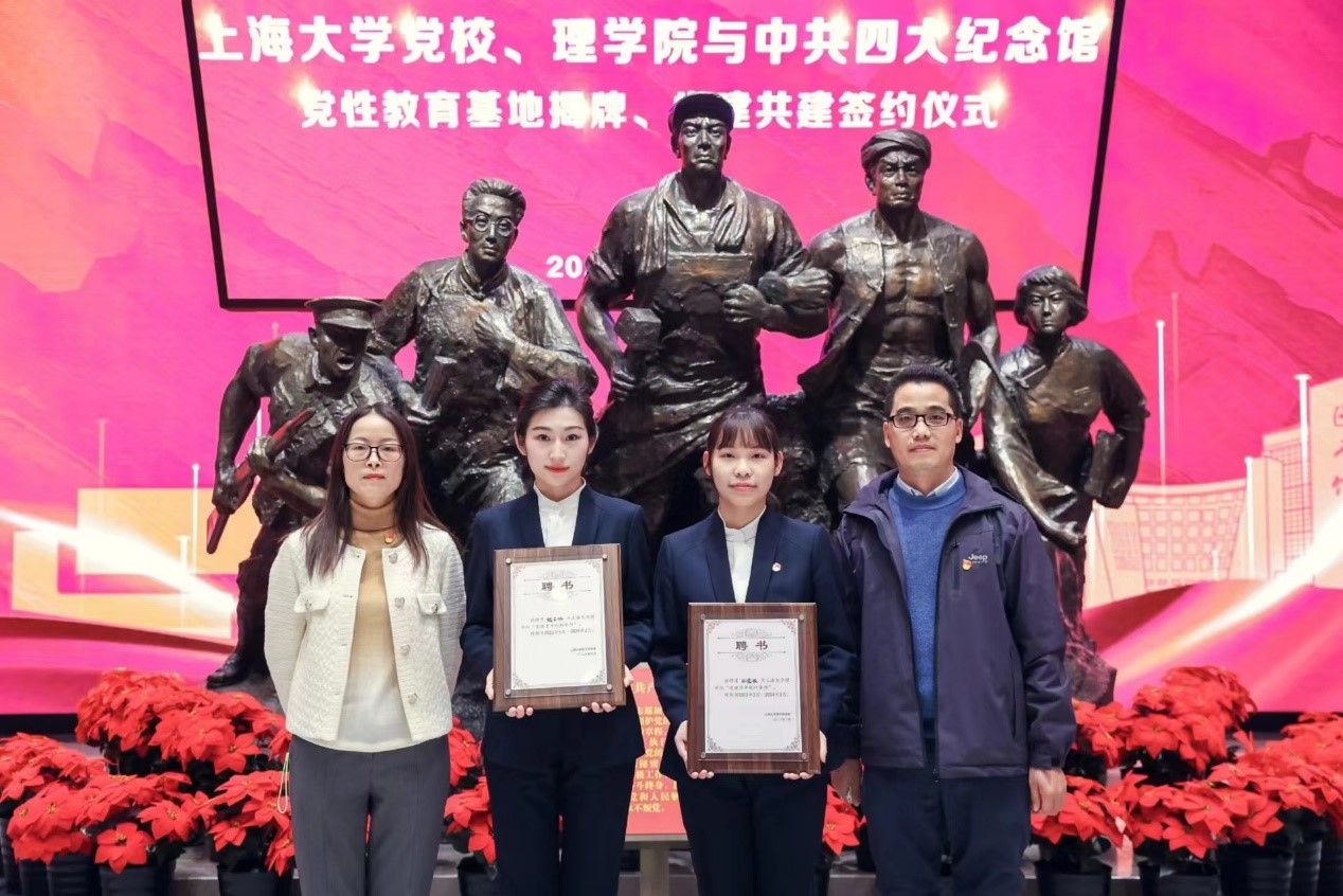 365英国上市集团党委副书记刘见礼、姚颖冲向中共四大纪念馆孙露依、倪吉琳颁发“党建青年标杆导师”证书。