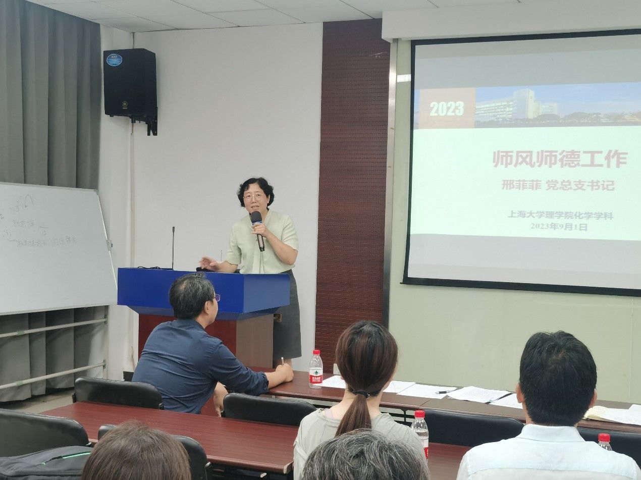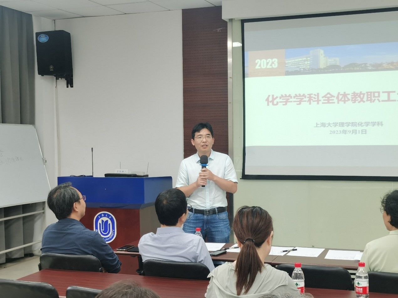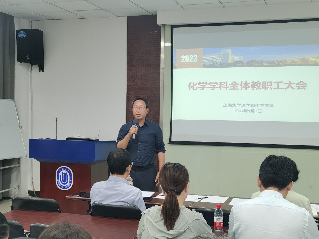 张登松回顾了2023年上半年,学科广大教职工在学科建设、科学研究、人才培养等工作上的努力工作和辛勤付出。今年化学学科获批国家自然科学基金项目16项,目前有国家级人才8人、国家领军人才4人。化学学科 ESI进入1‰;本科生喜获第四届全国大学生化学实验创新设计大赛总决赛特等奖,2023年上海市化学实验竞赛特等奖、一等奖,上海市实验创新设计竞赛一等奖、二等奖。他结合学院实际情况,对新学期工作提出要求,老师们要在学校和学院的正确领导下,围绕党的教育方针,紧跟学校发展目标,强化师德师风,主动担当作为,服务中心工作。