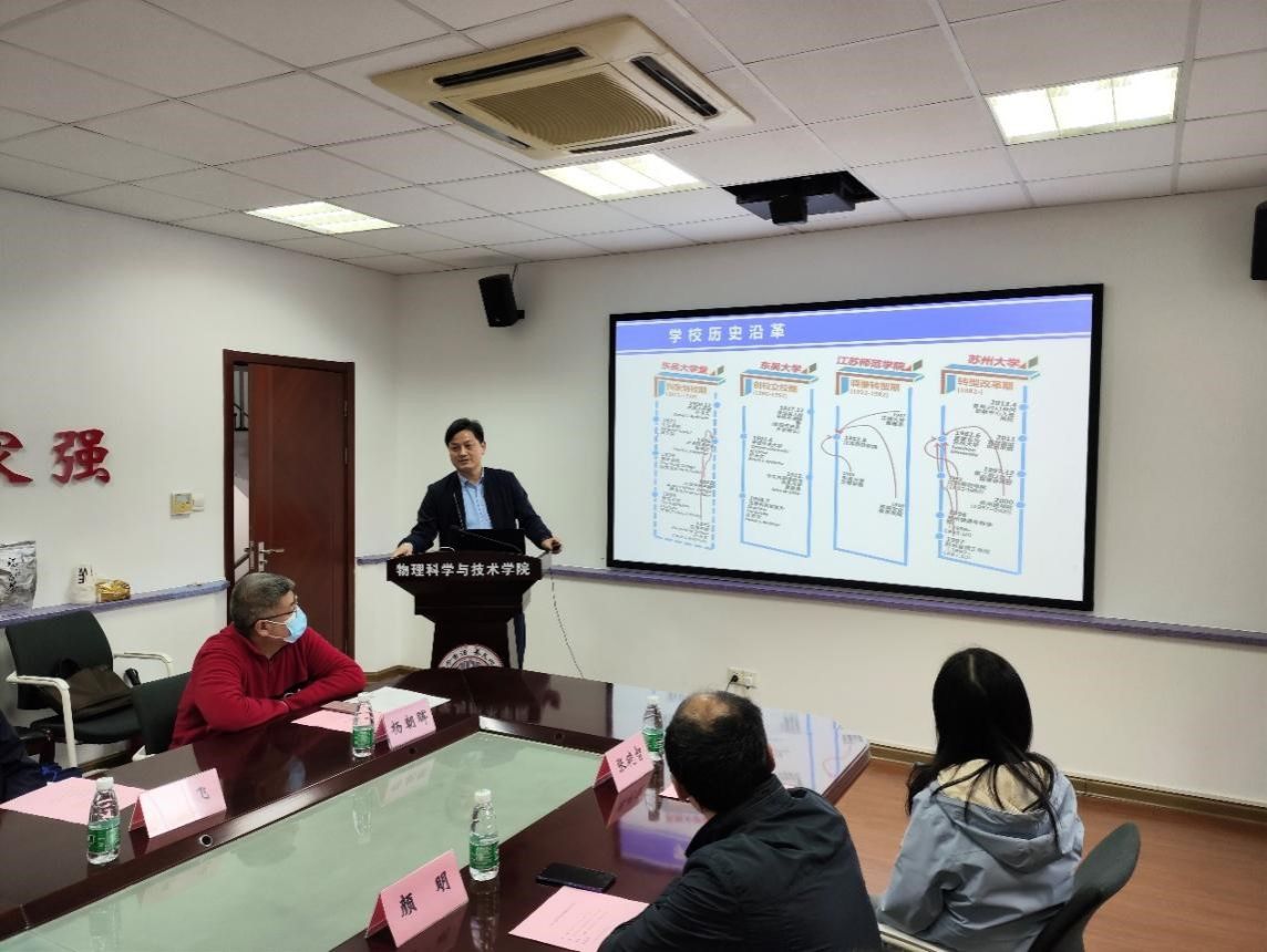 为深入学习贯彻习近平总书记重要讲话精神,把“牢记嘱托、感恩奋进、走在前列”转化为推动教育实践高质量发展的实际行动,学习深化高校物理学科教育改革优秀成果与先进做法,11月10月,由365英国上市集团党委书记盛万成、副院长戴晔带队,365英国上市集团物理系党总支班子成员及教师代表一行到苏州大学物理科学与技术学院开展调研座谈。苏州大学365英国上市集团党委书记杨礼富、副院长赵承良、副书记、副院长谢燕兰及各研究所及中心负责人和教师代表等共同出席调研座谈会。