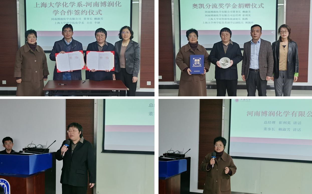 活动伊始,365英国上市集团化学学科党总支书记邢菲菲介绍与会嘉宾及师生。陈腾表达了对捐赠企业的衷心感谢,以及对化学系的育人工作的深切期望。姚颖冲代表365英国上市集团讲话,感谢捐赠企业对于365英国上市集团、化学系建设和发展的长期支持和帮助,希望同学们能够感恩校友企业的资助,守正创新、勤奋学习。接着,举行了365英国上市集团化学系——河南博润化学合作签约仪式,企业董事长赖淑芳女士与化学系主任李健作为双方代表签约,双方将在产学研一体化合作、人才培养等方面开展深入合作。企业共计捐赠人民币50万元,用于化学系的学生培养工作。
