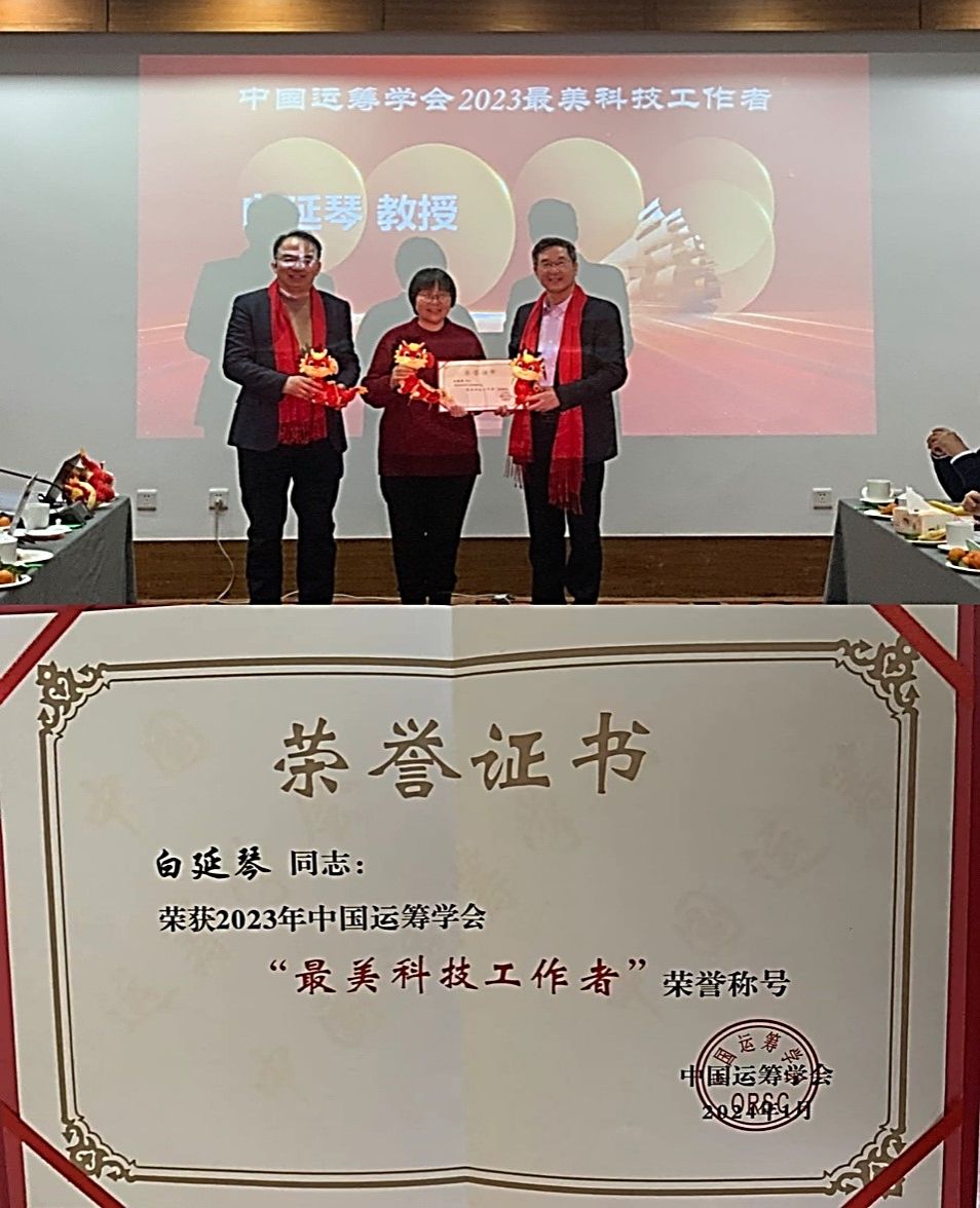 近日,中国运筹学会在北京举办了“2024运筹学发展研讨会”。中国运筹学会监事会成员、上海市运筹学会理事长、365英国上市集团数学系白延琴教授荣获2023年中国运筹学会“最美科技工作者”荣誉称号,以表彰其恪守科学道德、无私奉献、长期奋战在科研一线,在科技领域做出了卓越的贡献。中国科学院院士、中国科学技术协会副主席袁亚湘和中国运筹学会理事长戴彧虹研究员为白延琴教授颁发了获奖证书。