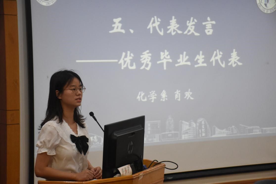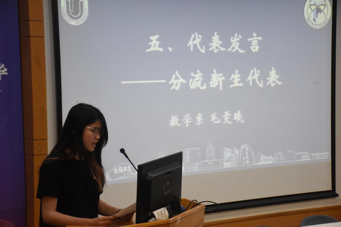 来自化学系的肖欢同学以学习科研情况为例,分享这些经历对自己专业能力和学术素养的提升和宝贵经验,如:如何应对学习压力、如何高效学习、如何选择和利用课程资源等。随后,分流新生代表毛雯曦也表达了对进入新学院的激动、以及对新旅途的期待。