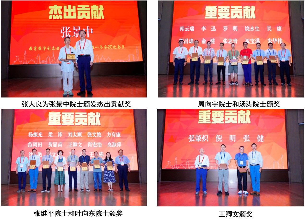在纪念中国高等教育学会教育数学专业委员会成立20周年活动上,中国高等教育学会副会长张大良为张景中院士颁发杰出贡献奖;中国科学院院士周向宇研究员、中国科学院院士汤涛教授为参会10次以上老师颁发荣誉证书;中国科学院院士张继平教授、中国科学院院士叶向东教授为历年学术年会承办单位代表颁发荣誉证书;专委会理事长王卿教授为专委会学术出版工作作出重大贡献的代表颁发荣誉证书。