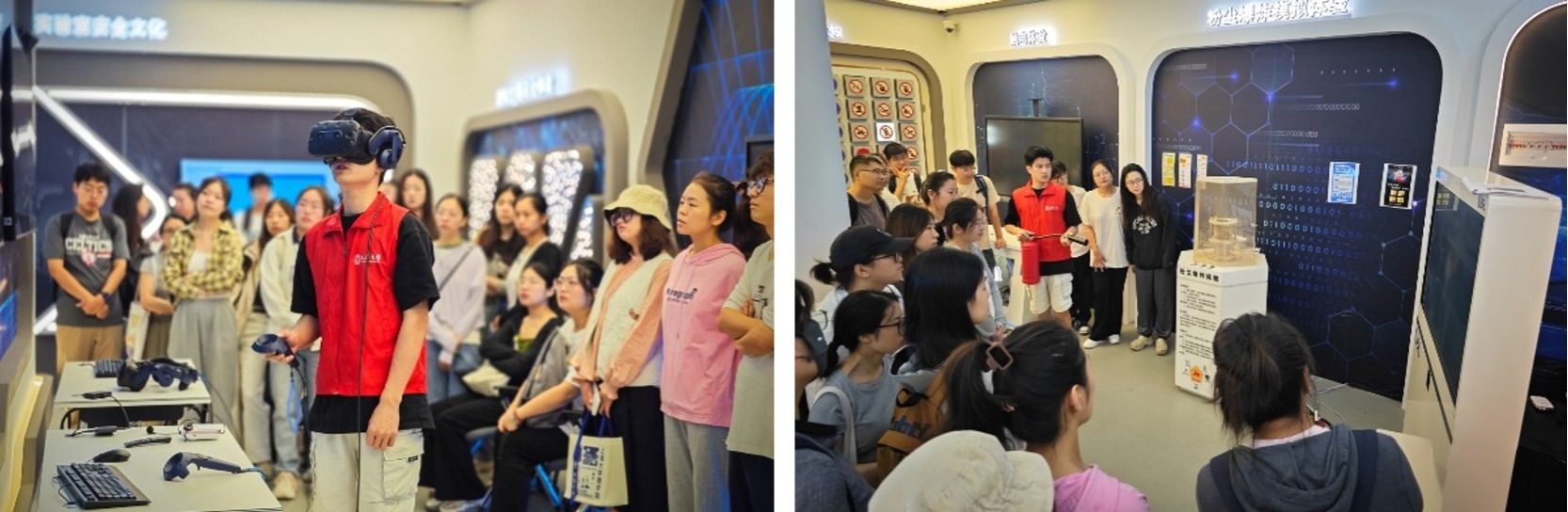 实训中心的志愿者讲解员通过多媒体演示,向同学们详细介绍了实验室安全的基本概念、法律法规要求。并带领同学们进入个人防护装备展示区,介绍各类防护用品的用途和正确佩戴方式;又在心肺复苏体验区做了心肺复苏急救的一整套教学示范;在VR体验区演示区佩戴VR设备完成了对实验室隐患的排查;还在灭火体验区教会同学辨别灭火器是否合格,以及如何正确使用灭火器。另外,讲解员还给同学们展示了安全标识认知互动区、触电体验区、粉尘爆炸体验区等。
