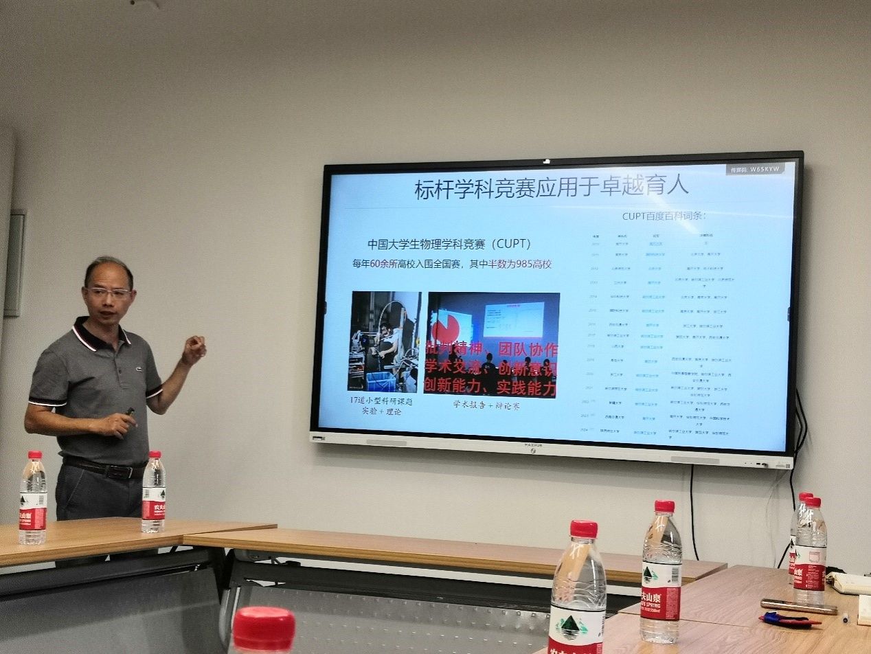 上午的研讨会由董光炯教授分享卓越物理人才培养中学科竞赛的驱动作用。董光炯教授来自华东师范大学精密光谱科学技术国家重点实验室,在物理和电子科学学院指导“提问与猜想”活动以及大学生物理学术竞赛(CUPT),是教育部“提问与猜想”活动特等奖和连续四届CUPT全国赛特等奖指导导师,获得华东师大本科教学特等奖(2024)、本科教学优秀奖(2024)、创新创业优秀指导教师(2022)。
