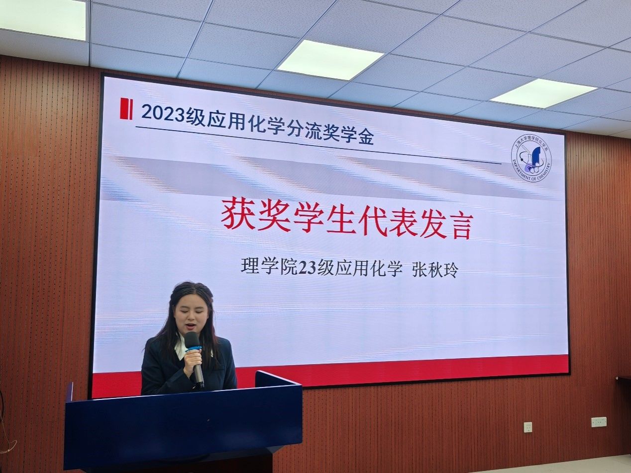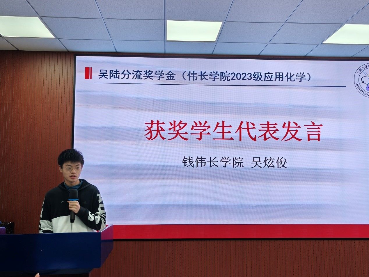 吴陆分流奖学金获奖学生代表吴炫俊同学以“海内存知己,天涯若比邻”表达了对校友们深深的感谢,并用自己在化学系学习的亲身经历,告诉同学们化学系的老师们会为大家提供无尽的温暖与力量。 “长风破浪会有时,直挂云帆济沧海”,吴同学勉励大家,要在充满挑战和未知的化学学科的海洋中乘风破浪,砥砺前行,创造辉煌,书写出属于自己的新篇章。