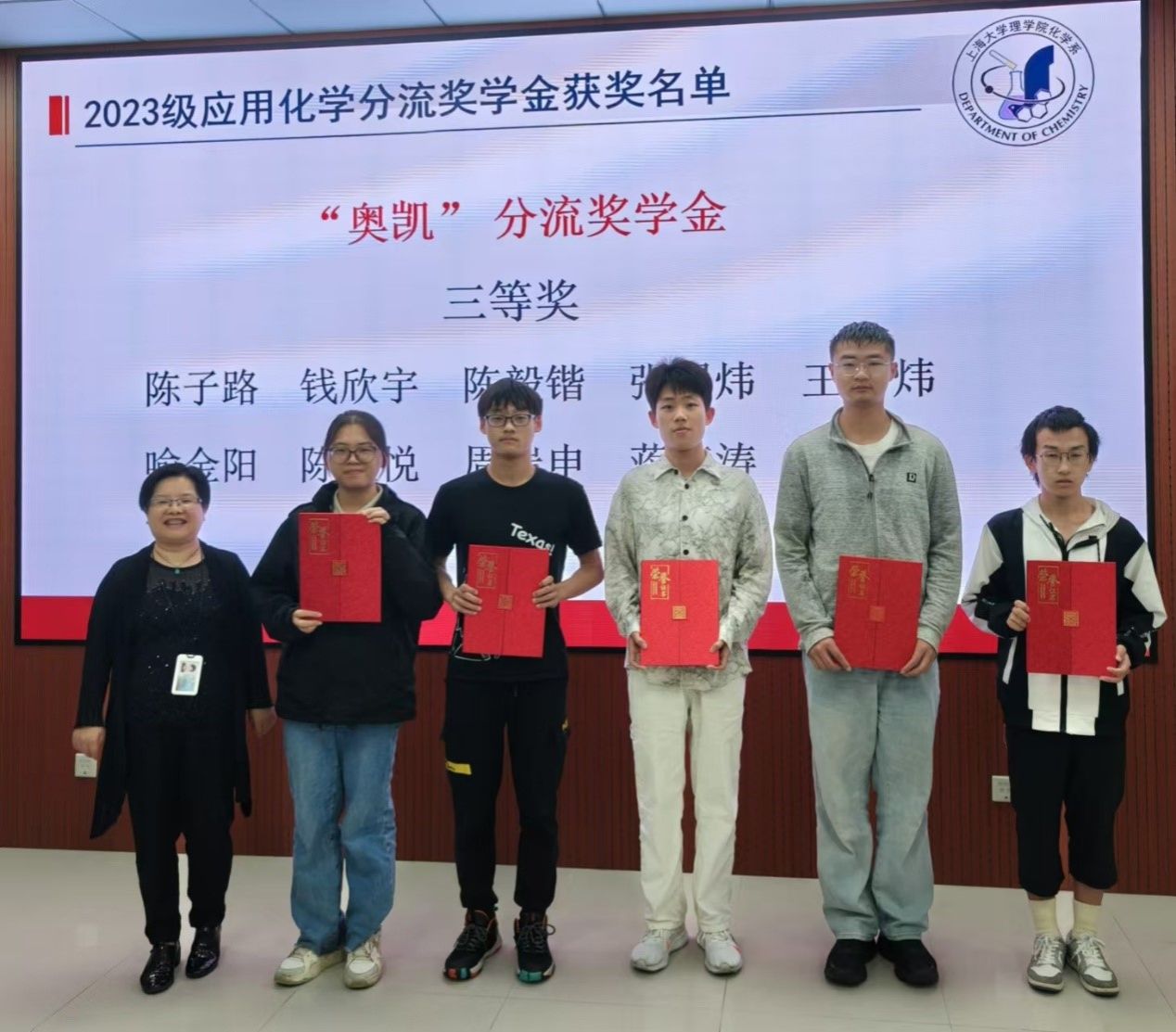 随后,主持人公布了奥凯分流奖学金和吴陆分流奖学金的获奖名单。洪玲、刘见礼、于瑞强三位老师分别为获得三等、二等、一等奥凯分流奖学金的同学们颁发了荣誉证书。邢菲菲和阮杜娟两位老师为获吴陆分流奖学金的同学们颁发了荣誉证书。