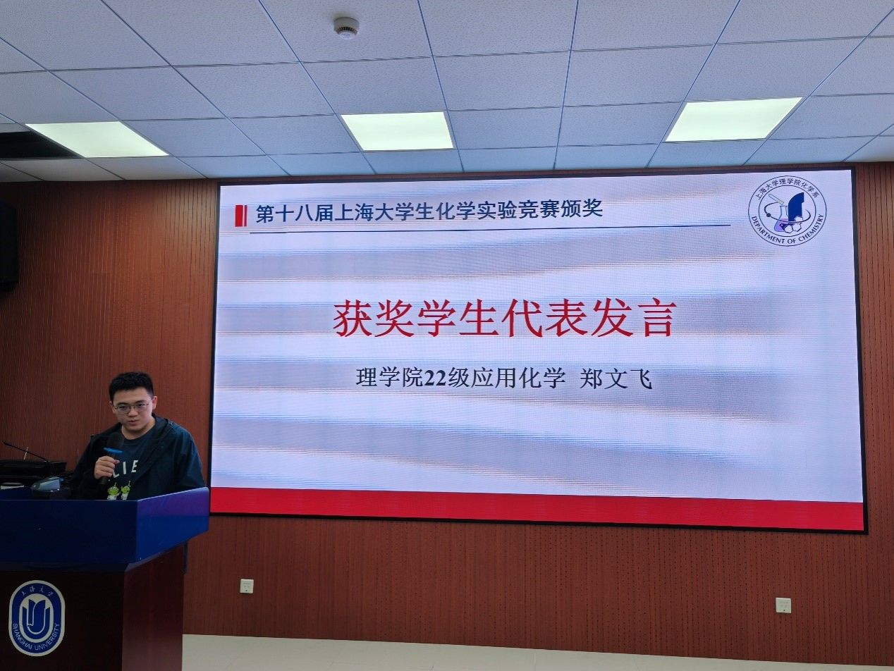 实验竞赛获奖学生代表郑文飞同学发言道,他感激化学系所有曾为大家提供了帮助和辅导的老师们。是他们给予的信心才让同学们面对实验有条不紊。他以“宝剑锋从磨砺出”强调了“细节”在实验中的重要性,并分享了自己经历失败、汲取经验再次挑战失败的经历,以此鼓励同学们培养实验者“一丝不苟、刨根问底”的精神。