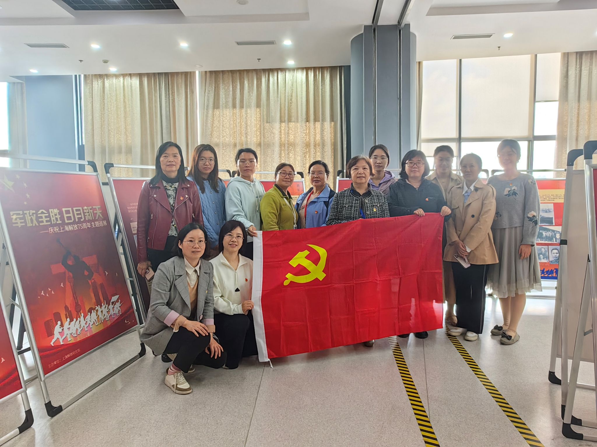 首先参观了东区钱伟长图书馆五楼“军政全胜,日月新天” ——庆祝上海解放75周年主题巡展。展览通过三大篇章和百余幅历史照片还原了中国人民解放军在中共上海组织和人民群众的配合下攻坚克难,获得全面胜利的光辉历史。驻足其间,党员老师们纷纷感叹上海解放战役的制胜奇迹、伟大意义以及当下幸福生活的来之不易。