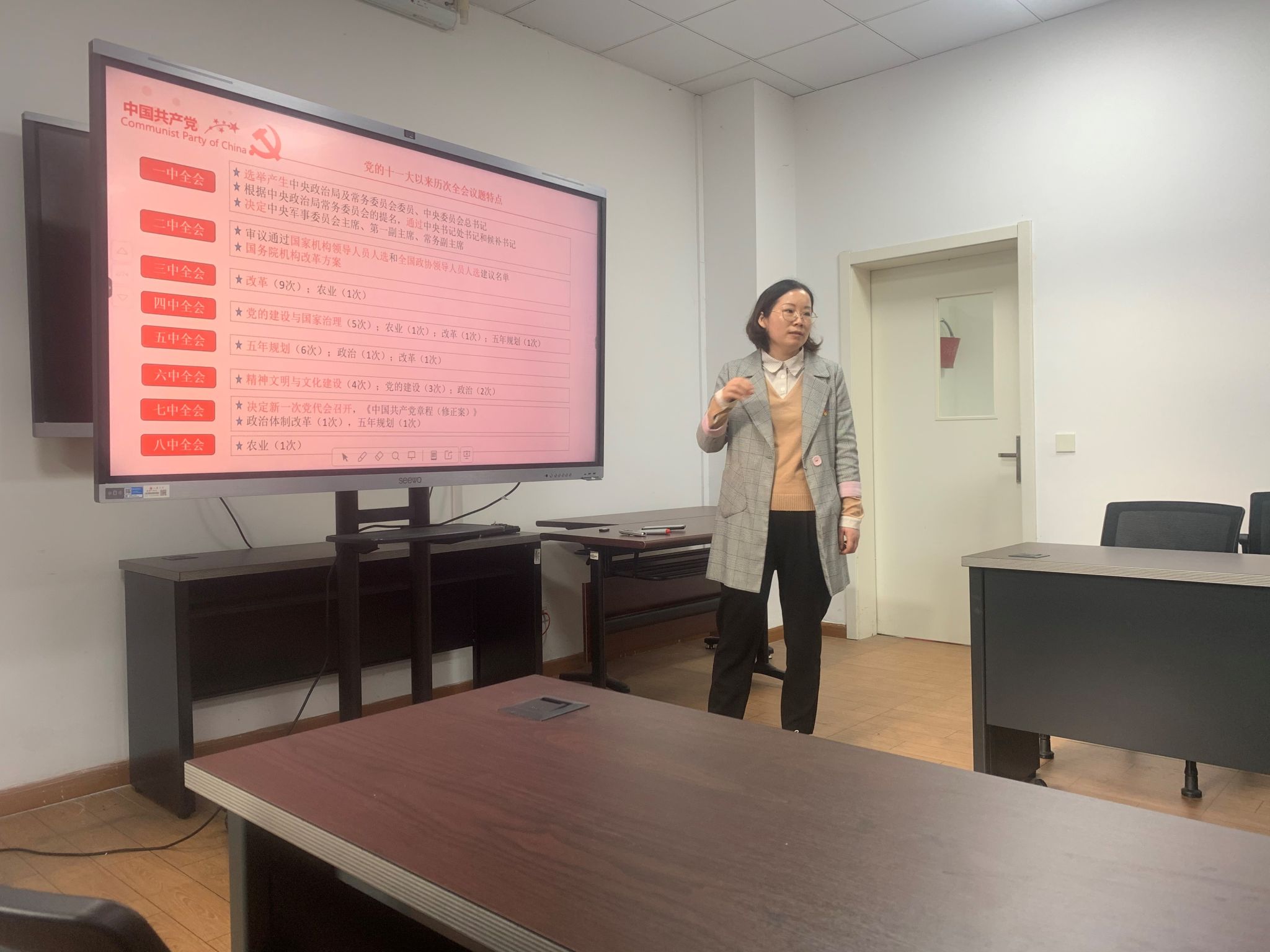 随后在HA101会议室,党支部书记王玉芹老师主持理论学习环节并讲党课。她围绕党的二十届三中全会的会议概况与主要议程、重要成果与深化改革重点、党的领导与建设和经济社会发展目标等方面进行了宣讲和阐释。结合化学实验教学中心的工作实际,党员老师们纷纷表示要认真学习贯彻全会精神,始终坚持以更高的政治自觉和更强的使命担当,不断提升实验技能,扎实推进各项工作任务,更好地为师生需求服务。
