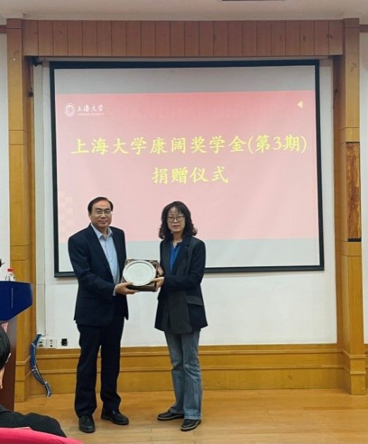 随后,物理系迎来了康阔奖学金(第三期)的捐助仪式。在庄重而盛大的典礼中,姚书记亲自为黄勇先生颁发捐赠纪念盘,并合影留念。