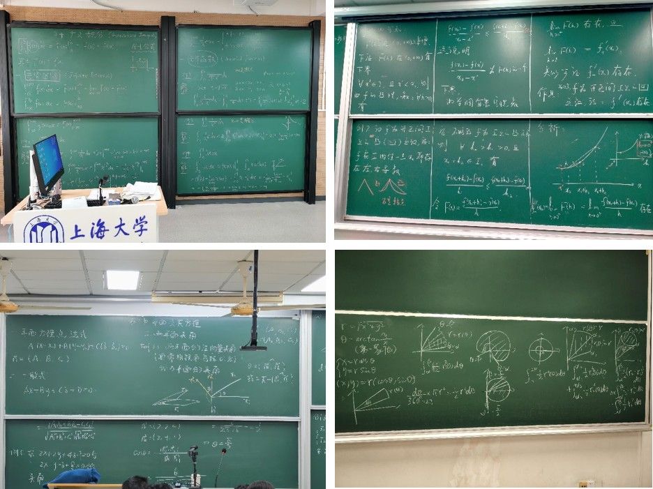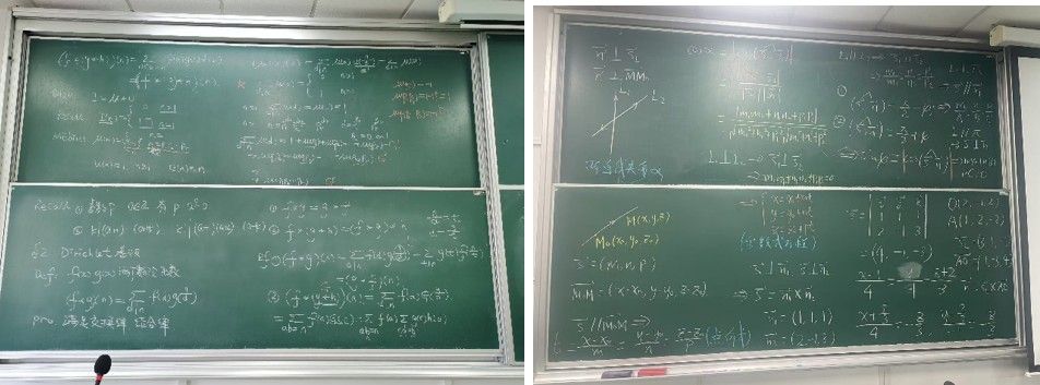 数学知识往往高度抽象,教师们通过板书将抽象的数学知识直观地呈现出来,通过板书来为同学们清晰呈现解题思路,方便让同学们理解问题的本质和证明的思路。有的老师通过主副黑板精心化解数学难点,将冗长的证明过程拆解成易于理解的步骤;有的老师用彩色粉笔标注重点,突出关键知识点;有的老师在板书中利用图形的变换演示数学定理的应用,让人眼前一亮。
