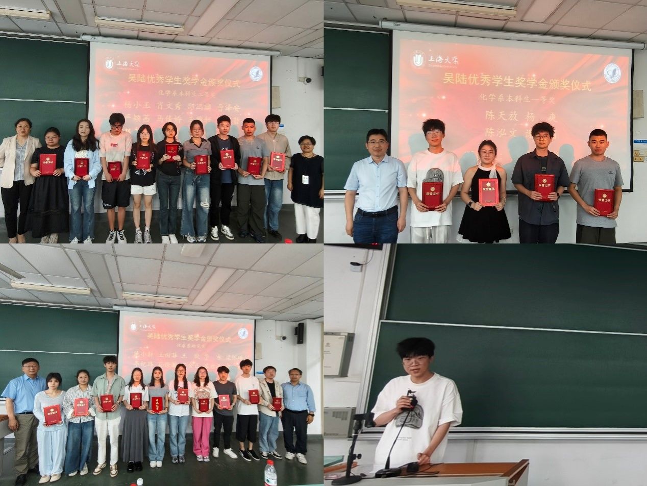首先颁发的是陈念贻奖学金。陆文聪详细介绍了陈念贻先生的生平,他提到“陈念贻先生最大的特点就是自强不息。他刻苦自学,心系化学人才培养”。李健依次介绍获奖同学及其学业成果,介绍了由化学系校友捐资设立的吴陆优秀学生奖学金,旨在激励化学学子爱国爱校、拼搏创新。随后,现场为陈念贻奖学金、吴陆优秀学生奖学金获奖者颁奖。