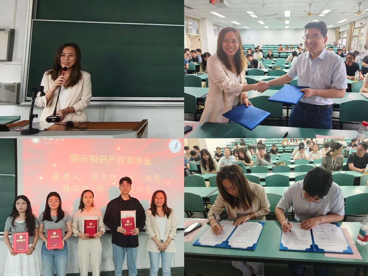 接着,徐婕超校友致辞,她在致辞中结合自身求学、工作经历,向同学们分享了生涯规划经验。她讲述设立弼兴知识产权奖学金的初衷,欢迎同学们毕业后进入知识产权领域发展。随后,举行了弼兴知识产权奖学金捐赠签约仪式,徐婕超校友、李健代表双方签约。上海弼兴律师事务所已连续多年捐赠奖学金,为化学系的人才培养做出了贡献。现场为弼兴知识产权奖学金获奖者进行了颁奖。