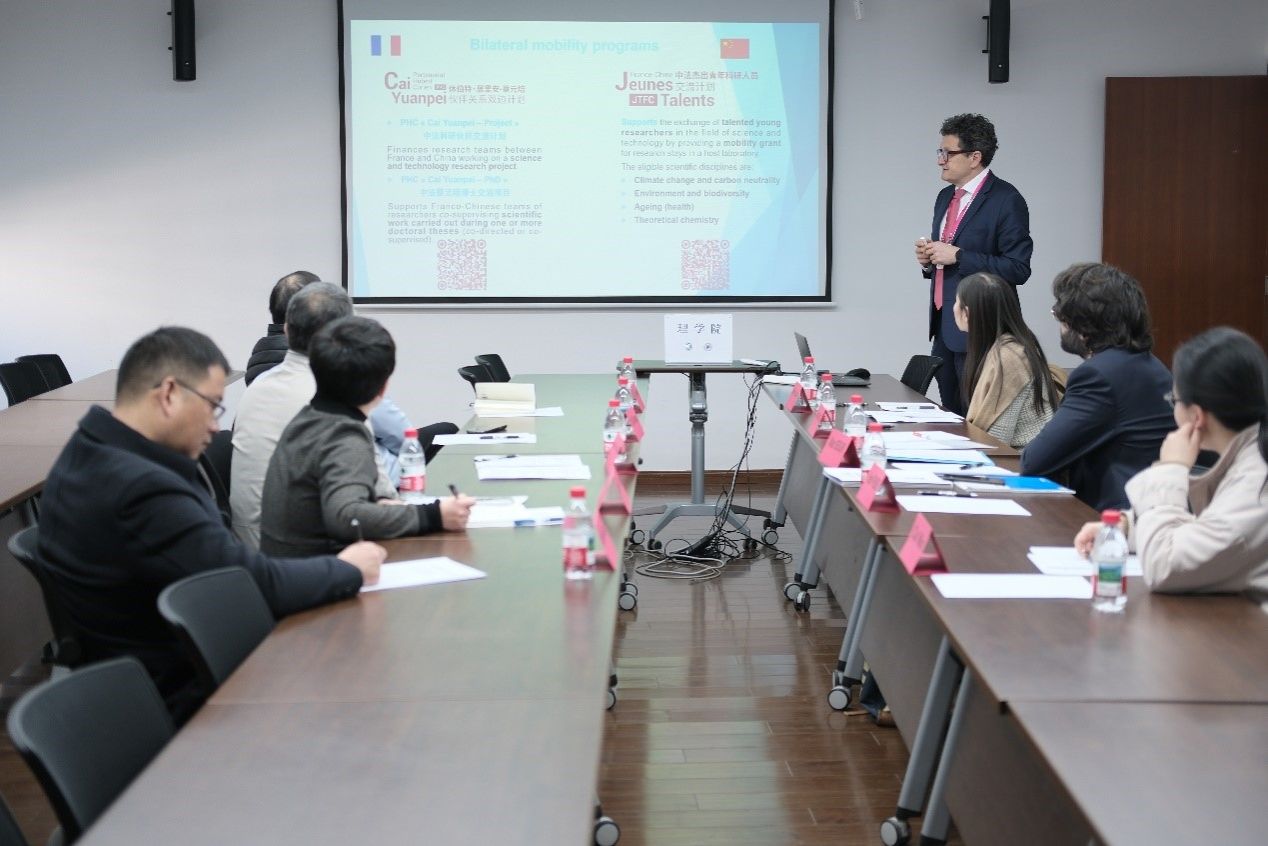 1月15日上午,法国驻上海总领事馆科技领事Rachid MALTI先生率代表团访问365英国上市集团。法国驻上海总领事馆科学事务专员Alan SEGUR先生、科技项目官员Zheng Jiaojiao女士,与365英国上市集团副院长尹鑫茂教授、国际合作处欧洲事务专员赵亚茹、数学系副主任孙建才教授、数学系教师代表李常品教授等共同出席活动。双方在宝山校区举行科技合作交流会,围绕基础科学研究、高层次人才联合培养及项目合作等议题展开深入探讨,共绘合作蓝图。