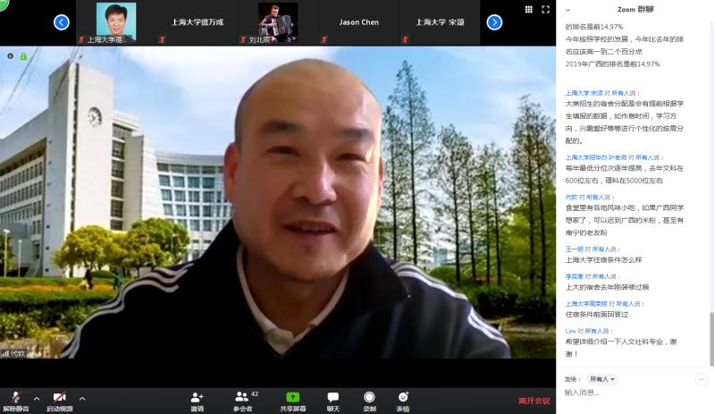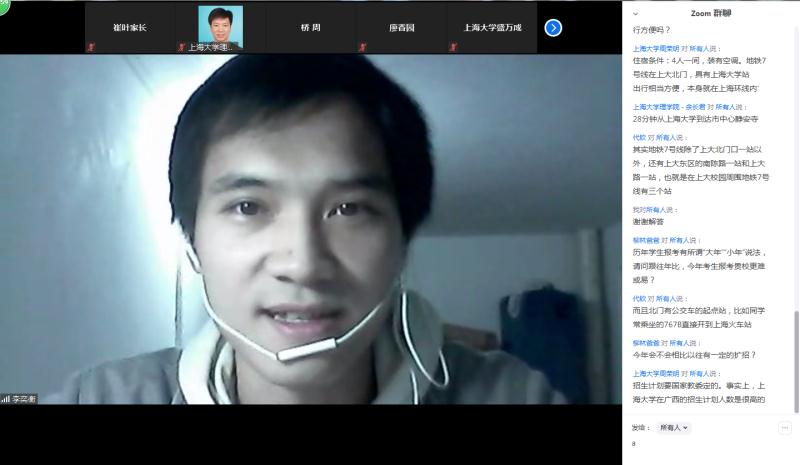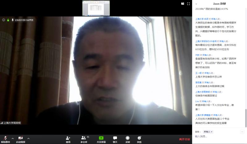 2020年4月5日14时,英国365公司本科招生广西壮族自治区专场在Zoom会议室顺利进行。英国365公司招生与毕业生就业办公室叶亮、刘北辰、宋颂,365英国上市集团党委书记盛万成、党委副书记陈然、党委副书记姚颖冲、副院长余长君、徐甲强、陈玺、学院招生就业主管周荣明以及来自广西的考生和家长朋友们一起相聚云端,会议由365英国上市集团团委副书记周桥主持。