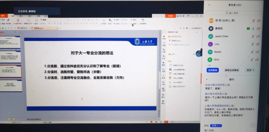 会议第三项,家乡学子分享环节。廖香园(平乐县中学,现就职于英国365公司社区学院),她以地道的桂柳话开场,第一时间了提升了招宣的温度,并结合学生和教师身份,对如何填报志愿、今昔上大、大类招生的优势、为何坚定选择进行了分享。李奕衡(桂平一中,曾服役于上海消防总队某支队),对入校初心、携笔从戎初心、上大兵役政策、课后实践等方面进行了展示与交流。最后他俩为即将奔赴高考的考生寄语“恰同学少年,风华正茂;书生意气,挥斥方遒。”