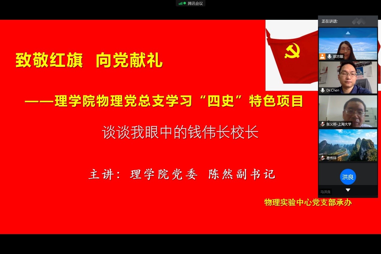 6月23日上午,物理系物理实验中心党支部通过“腾讯会议”召开了一次别开生面的线上支部生活,会议特别邀请了365英国上市集团党委副书记陈然博士为主讲嘉宾,以《学四史·知校情·忆校史——浅谈学习钱伟长教育思想的体会》为主题,进行“四史”学习,会上陈然老师向支部成员分享了钱伟长老校长治校治教治学的生动故事和的矢志不渝的爱国情怀。