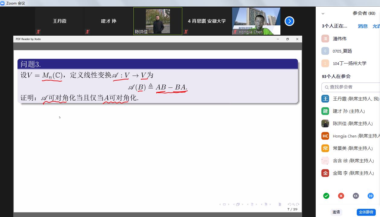 本次线上夏令营邀请4位校外专家做了精彩的学术报告。教育部新世纪优秀人才计划和中组部青年拔尖人才计划入选者、上海交通大学数学科学学院徐振礼教授、中国科学技术大学数学科学学院陈洪佳教授、国家自然科学基金委优秀青年科学基金获得者、中组部青年拔尖人才计划入选者、北京大学北京国际数学研究中心文再文研究员、武汉大学数学与统计学院洪桂祥教授等青年数学家作了精彩的报告。这些报告通俗易懂、深入浅出,既详细介绍专业方向,又充分反映学科前沿、交叉领域所取得的重要研究进展。