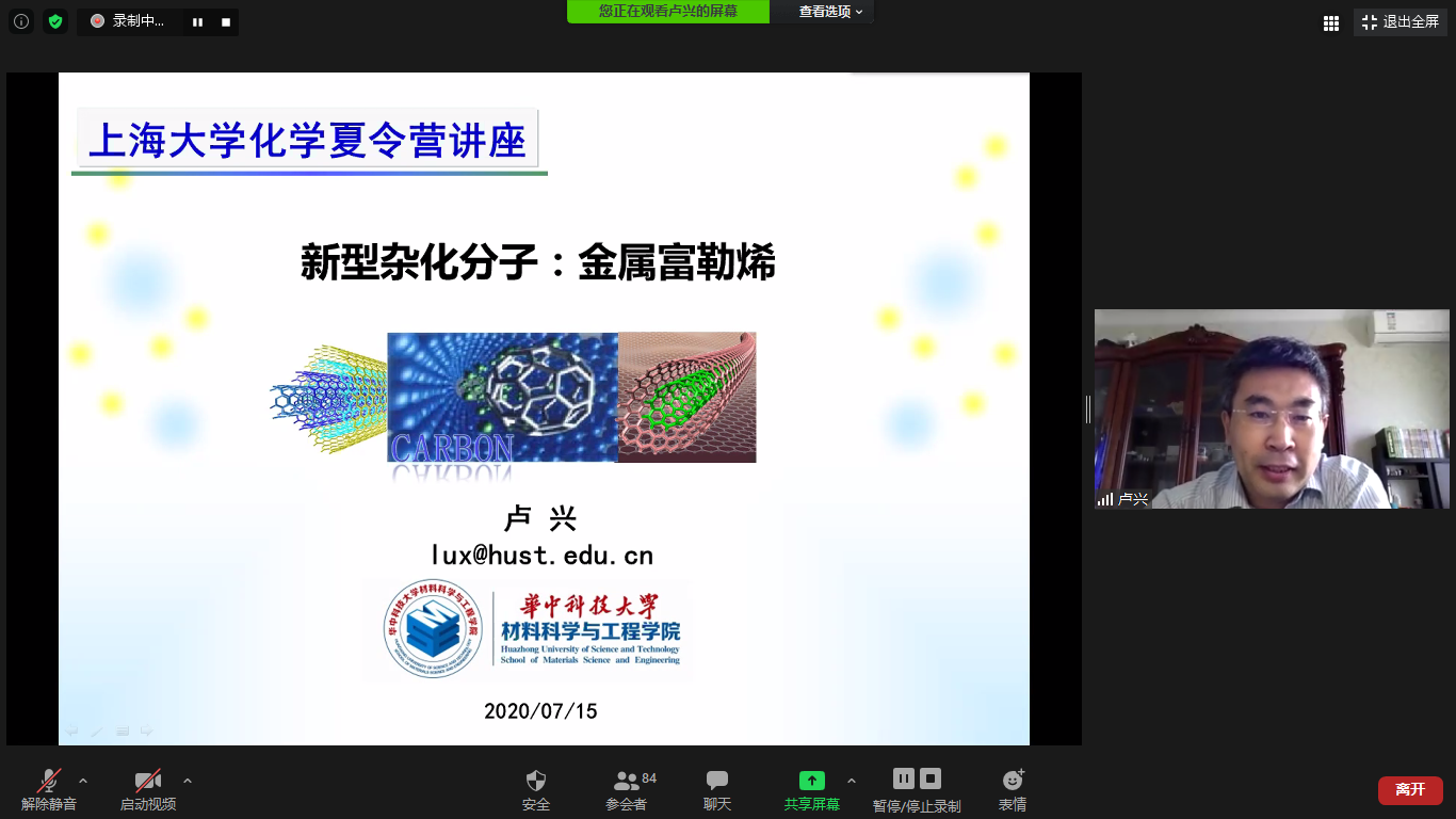 2020年7月15日-16日,化学系举办2020年全国优秀大学生线上夏令营,共有来自湖北大学、福州大学、河南大学、山西大学、四川师范大学、浙江师范大学、杭州师范大学、淮北师范大学等全国各地高校的80名学生参加了夏令营。