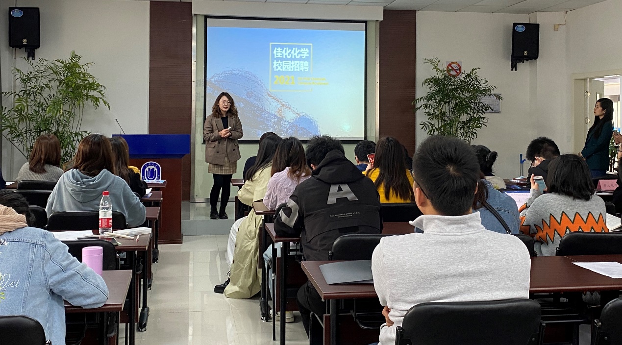 宣讲会上,金山第二工业园区总经济师董晓丹首先向化学系学生介绍了金山第二工业园区的整体情况。接着来自工业园区的五家公司——中轻日化科技有限公司、上海东大化学有限公司、上海奥威日化有限公司、上海抚佳精细化工有限公司、上海东睿化学有限公司的代表,以及SGS通标标准技术服务有限公司的代表和天美(中国)科学仪器有限公司的代表通过播放宣传片、PPT展示、面对面交流等方式向同学们介绍公司的概况、职业发展方向、人员需求以及选择该单位的理由。
