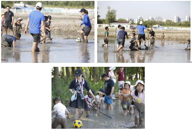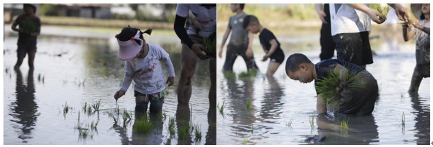 在嘉定马陆的田野里,“理二代”小朋友跟着爸妈一起光脚踏入了水田,他们摸泥鳅、学插秧,体验了一番“汗滴禾下土”的劳作场景。