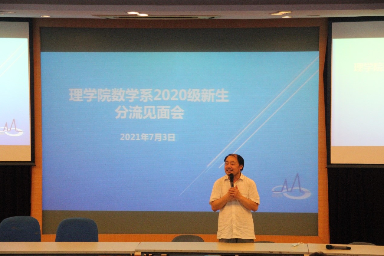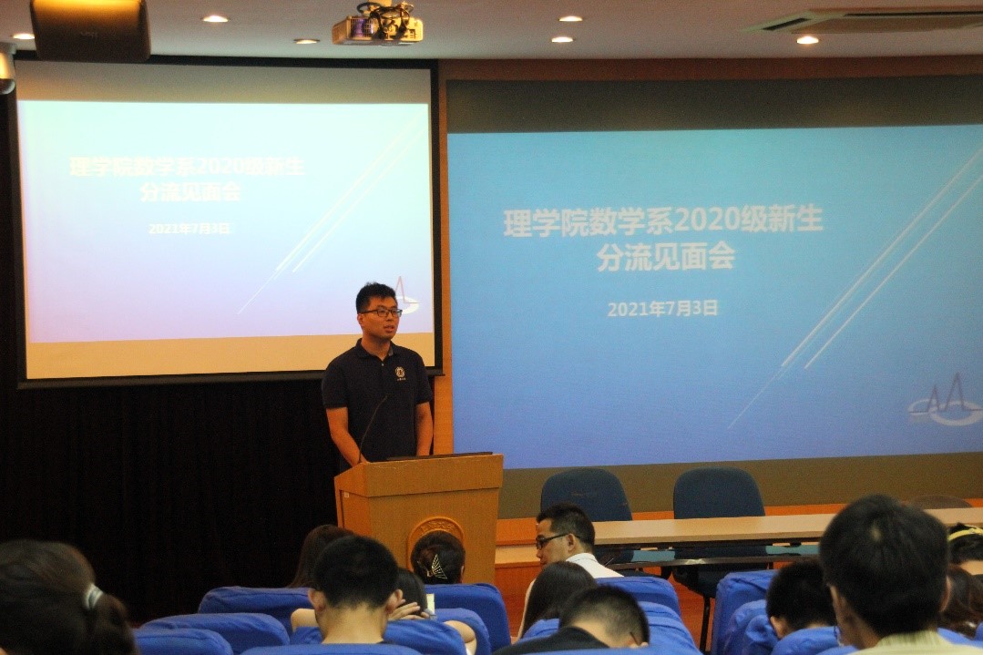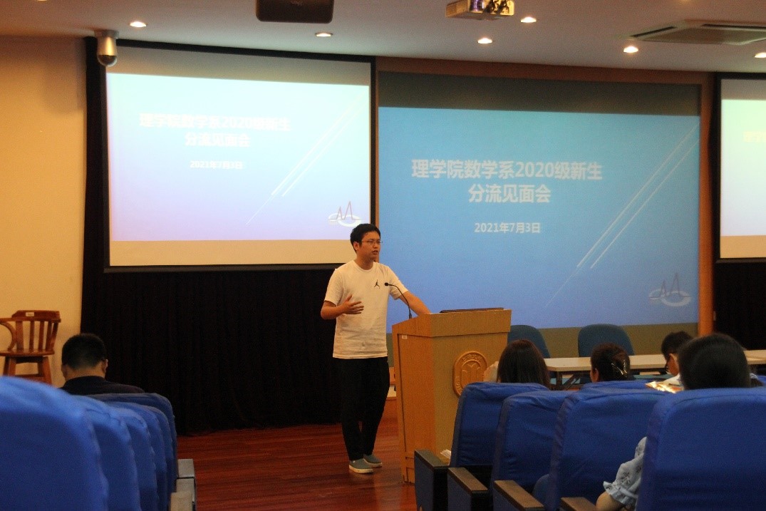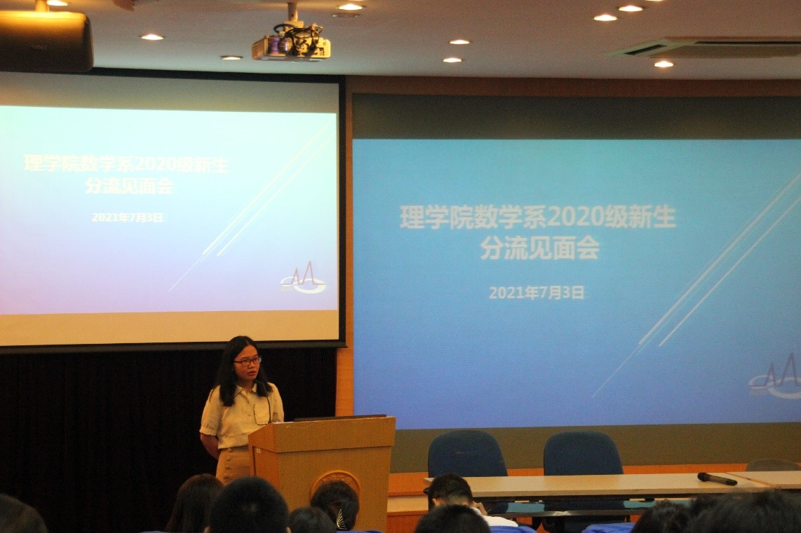 三位2017级优秀学生代表王罗昕、冯子懿和赵天堃结合自己在数学系学习和工作的经历,分享了自己在数学系就读的心得体会和学习经验。三位学长学姐希望同学们诚实勤奋,静下心来专心学习,祝同学们都能取得成功,在数学系度过充实且丰富多彩的三年。