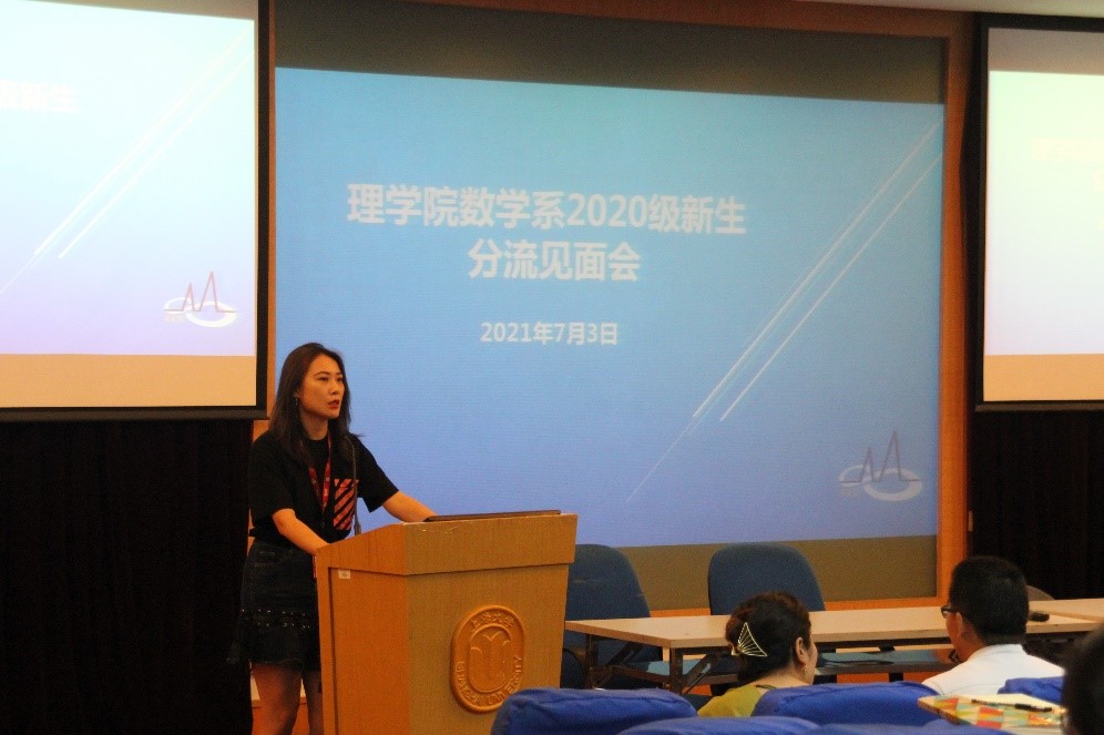 2020级数学系辅导员王进老师首先欢迎各位2020级同学们来到数学系,接着她对自己的工作情况作了简单的介绍,对宿舍分配、试读警告和信息通知等注意事项做了强调,王老师希望同学们在注重学习的同时要加强对身体的锻炼,她会尽力给各位同学提供在数学系学习和生活的良好环境,也希望各位同学能够积极配合自己的工作。