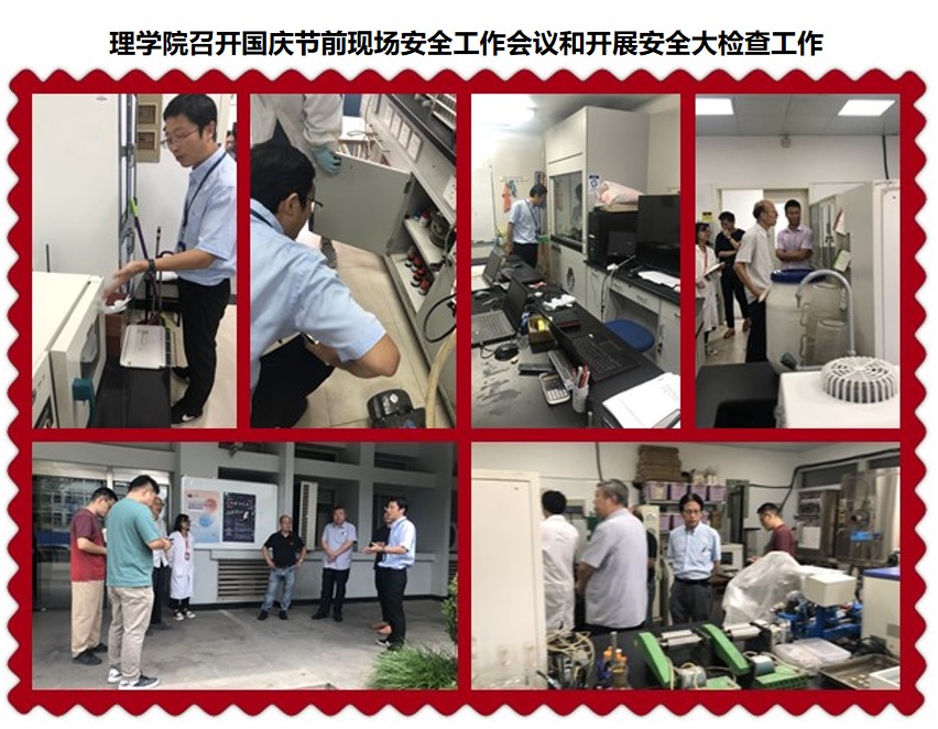 现场会议结束后,常务副院长张登松以及各部门党政负责人及安全员们一同前往学院各部门开展节前安全大检查工作。本次先后对我院的化学系科研实验室、纳米中心、可持续能源研究院、物理系教学科研实验室及机房、数学系实验室等部门的重点区域进行了详细全面的安全检查。检查发现个别实验室仍存在问题隐患,望大家做到举一反三,抓好安全风险防控,坚决遏制事故,确保节日期间我院的安全稳定。