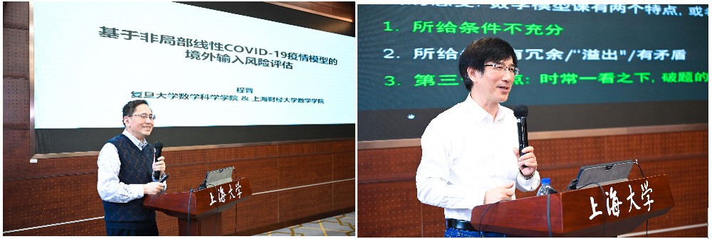 在上午,大会邀请了程晋教授、楼红卫教授分别作了大会报告。程晋以“基于非局部线性COVID-19疫情模型的境外输入风险评估”为题介绍了他们对“COVID-19疫情模型”研究的成果,该成果获得了上海市自然科学奖二等奖。楼红卫教授以“大学教学探讨——为人之师,学之捷径”介绍了复旦大学教师在教学实践中的探索,同时阐述这些实际探索在培养拔尖人才的作用。