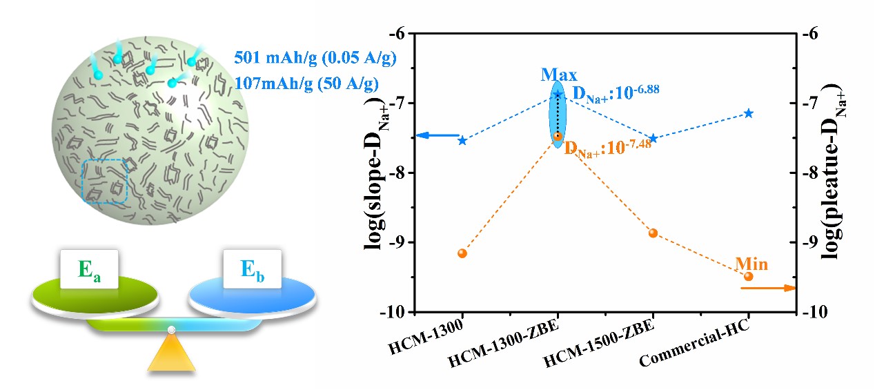 钠离子电池是极具潜力的新一代电化学储能技术,具有无资源限制、低成本、高安全等优势,同时由于钠离子具有较低的溶剂化效应,低温性能也备受期待。硬碳材料拥有合适的平台电位、良好的结构稳定性和优异的可逆容量,是当前最具商业化前景的钠离子电池负极材料。但是在低电位平台区硬碳材料的钠离子扩散系数大幅降低,导致其倍率性能较低(<5 A g-1) ,不能满足钠离子电池大规模应用的要求。提升硬碳材料在低电位平台区的离子扩散速率,是钠离子电池商业化亟待解决的主要瓶颈之一。