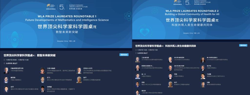 其中,敖平教授受邀出席两场“世界顶尖科学家科学圆桌π”活动,涉及主题分别为:“数智未来新突破”及“科技共筑人类生命健康共同体”。“数智未来新突破”圆桌讨论邀请了一位图灵奖得主,首届WLA Prize“智能科学或数学奖”获奖者,一位中国工程院院士及包括敖平教授在内的五位相关领域顶尖学者,就数智科技前沿以及数据、信息技术发展新趋势进行交流;“科技共筑人类生命健康共同体”圆桌讨论邀请了三位诺奖得主,首届WLA Prize“生命科学或医学奖”获奖人,四位中科院院士,以及包括敖平教授在内的六位相关领域的顶尖学者,就生命科学前沿研究与最新突破进行交流。