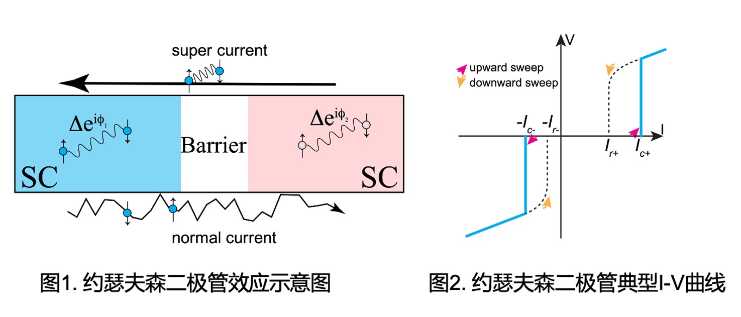 约瑟夫森二极管效应可以被看作是半导体二极管在超导约瑟夫森结中的类比。具体而言,如图1所示,约瑟夫森二极管效应的基本特征就是当电流向左传导时表现出无耗散的超导电流;当电流向右传导时表现出耗散的普通电流。该二极管的电流-电压特征曲线如图2所示, 系统存在一个正向 (这里为向左) 临界电流 I_(c+)。当正向电流 I<I_(c+) 时,系统表现出典型的零电阻现象; 当电流 I>I_(c+)时,系统表现出 V≠0 耗散的正常电阻。同样,在反向电流中,存在另外一个临界电流 〖-I〗_(c-)。I_(c+)≠I_(c-) 就是二极管的特性现象。如果施加一个幅度 I_0电流方波(I_(c-)<I_0<I_(c+)),系统则表现出向左超导,向右电阻的二极管效应。对于约瑟夫森结而言,除了 I_c 二极管效应外,由于存在势垒层和在扫描过程中的电荷积累,约瑟夫森结还存在一个回归电流 I_r。I_(r+)≠I_(r-)是约瑟夫森结的另外一个二极管特征。