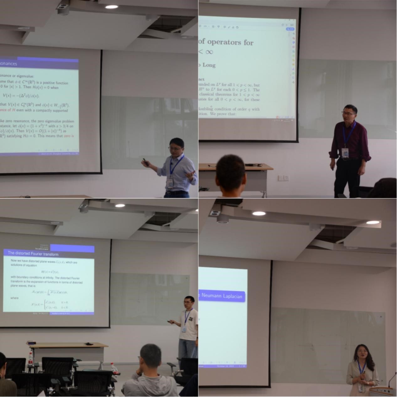 14日下午,华中师范大学尧小华教授作了题为“On the Lp bounds of Fourth order wave operators on R^3”的报告;湘潭大学龙顺潮教授作了题为“On the estimate of operator for 0<p<infty”的报告;华中师范大学邓清泉副教授作了题为“The modified scattering for cubic NLS with double-well potential in dimension one”的报告;北京林业大学章娟老师作了题为“Riesz transforms associated with the Neuman Laplacian”的报告。