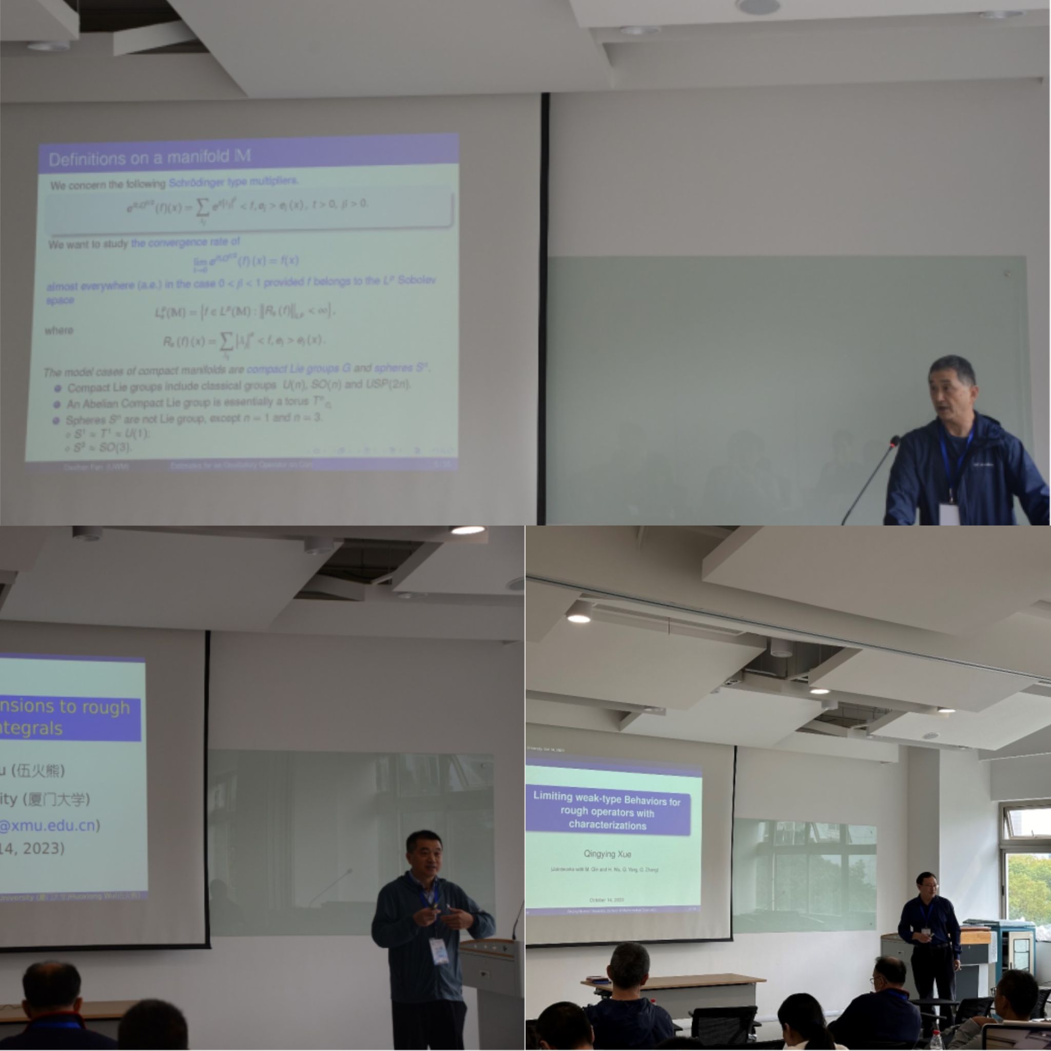 14日上午,美国威斯康辛大学密尔沃基分校范大山教授作了题为“Estimates of a maximal oscillatory integral on compact manifolds”的报告;厦门大学伍火熊教授作了题为“From Fourier expansions to rough singular integrals”的报告; 北京师范大学薛庆营教授作了题为“粗糙核算子的弱极限行为问题和二个刻画”的报告。