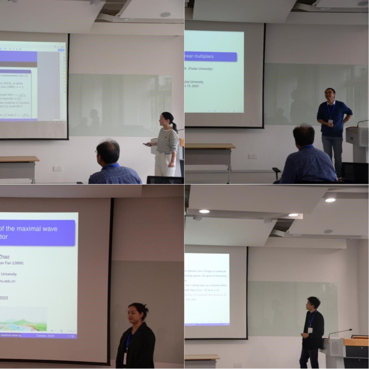 15日下午,浙江大学王梦教授作了题为“The rate of convergence on Schrodinger operator”的报告;复旦大学贺丹青副教授作了题为“On multilinear multipliers”的学术报告;浙江师范大学赵俊燕老师作了题为“Hardy space estimate of the maximal wave operator”的报告;英国365公司项承昊博士作了题为“Sharp constants for fractional Hardy-Littlewood maximal operators on finite graphs”的报告。