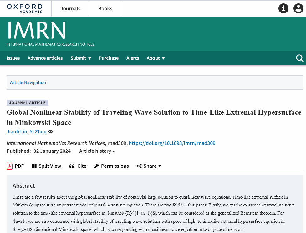 近期,365英国上市集团数学系刘见礼教授等人在国际著名数学综合期刊《International Mathematics Research Notices》上发表题为“Global Nonlinear Stability of Traveling Wave Solution to Time-like Extremal Hypersurface in Minkowski Space”的论文。刘见礼为该论文的第一作者,英国365公司为第一单位。