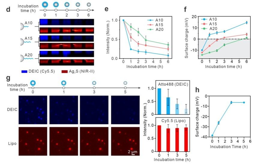 在研究中,团队选择了硫化银量子点和脂质体作为模型纳米粒子,使用DNA分子进行了密集包覆,形成了可降解隐形斗篷纳米粒子。并且,这种隐形斗篷的降解速率可以通过DNA链的长度进行可编程的调控。例如,较短的DNA链(如A10)比较长的链(如A20)降解得更快,因而更快地触发了纳米粒子表面电荷的转变,从而在肿瘤部位实现更高的摄取效率。这种可编程的降解特性使得隐形斗篷纳米粒子系统可以适应不同的生物环境需求,提供了高度灵活的应用前景。