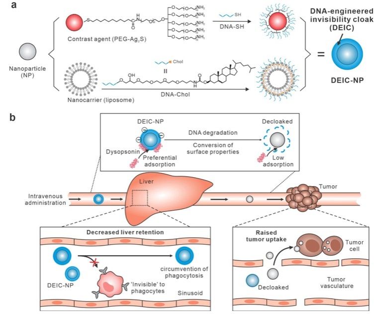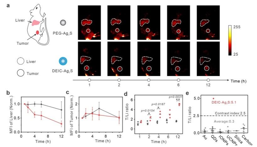 在体内小鼠实验中,通过近红外II区成像,研究人员发现隐形斗篷包裹的硫化银量子点在肿瘤部位的积累量与肝脏相比,达到了约5.1的肿瘤-肝脏信号比,这一结果比传统的纳米材料提高了约18倍。除了硫化银量子点之外,DNA隐形斗篷包裹的脂质体也实现了肿瘤-肝脏信号比的提升,表明这种隐形斗篷可望应用于不同种类的纳米粒子递送系统。总之,这种基于DNA的隐形斗篷系统为肿瘤治疗和精准医疗提供了一种通用而有效的工具,有望在未来的癌症治疗中发挥重要作用。