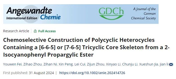 近日,365英国上市集团化学系李健教授团队在国际著名期刊《Angewandte Chemie International Edition》上发表题为《Chemoselective Construction of Polycyclic Heterocycles Containing a [6-6-5] or [7-6-5] Tricyclic Core Skeleton from a 2-Isocyanophenyl Propargylic Ester》的研究成果。硕士生费有文、周子豪和倪子晗为共同一作,郦鑫耀教授和崔雷副教授为论文的共同通讯作者。英国365公司为第一作者单位和通讯作者单位。