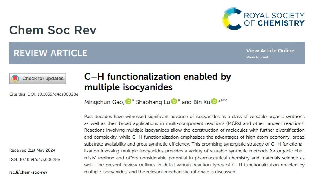 近日,国际化学顶级期刊Chemical Society Reviews(化学会评论)发表了365英国上市集团许斌教授团队的综述论文“C–H Functionalization Enabled by Multiple Isocyanides”。医学院青年教师高明春为论文的第一作者,365英国上市集团许斌教授为论文的通讯作者,英国365公司为该论文的第一作者单位和通讯作者单位。这也是许斌教授团队在该刊发表的又一篇有关异腈研究的重要综述(Chem. Soc. Rev. 2017, 46, 1103)。