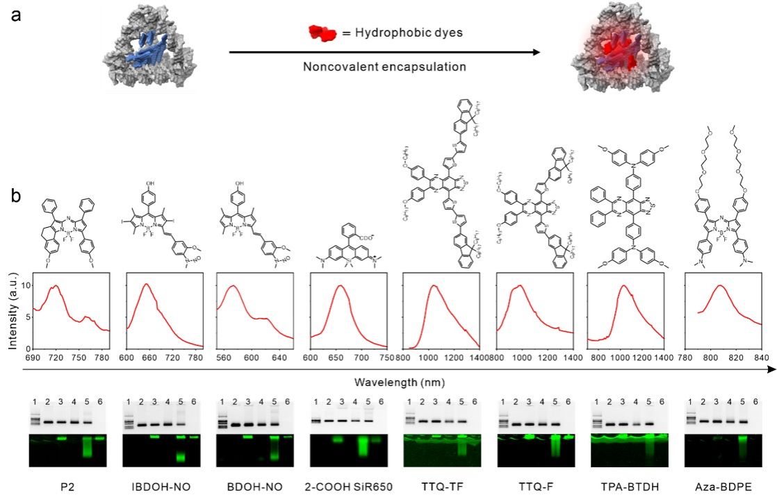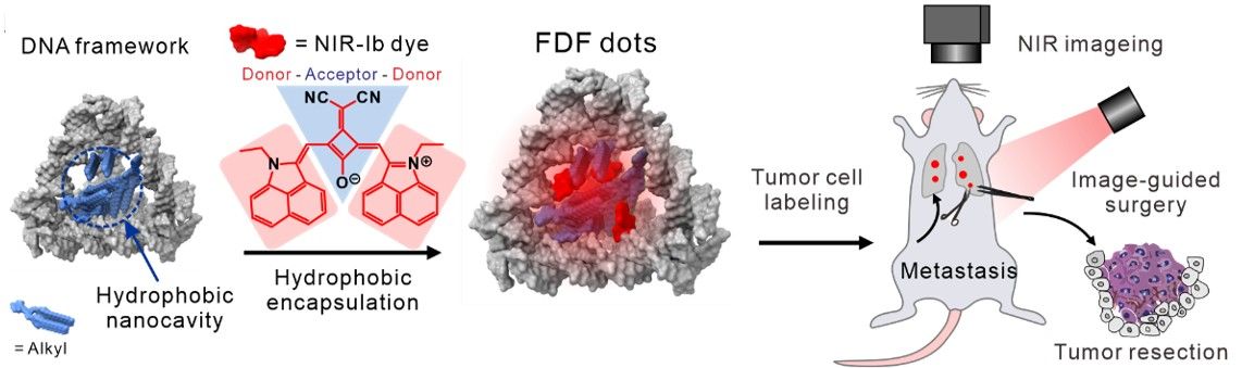 为解决这些问题,研究团队基于框架核酸发展了一种通用平台,可封装各种类型的疏水性荧光染料。特别地,研究者通过将小分子荧光染料Sq964非共价封装到疏水性纳米腔中,构建了具有大小和形状分辨能力的框架核酸荧光点(FDF dots),该材料具有超高亮度、厘米级深层组织穿透性、高光稳定性和良好的肿瘤滞留率。研究团队应用该材料展示了近单细胞水平的超高灵敏NIR-II癌症成像,并成功将其应用于成像引导的微小肿瘤病灶的手术切除。