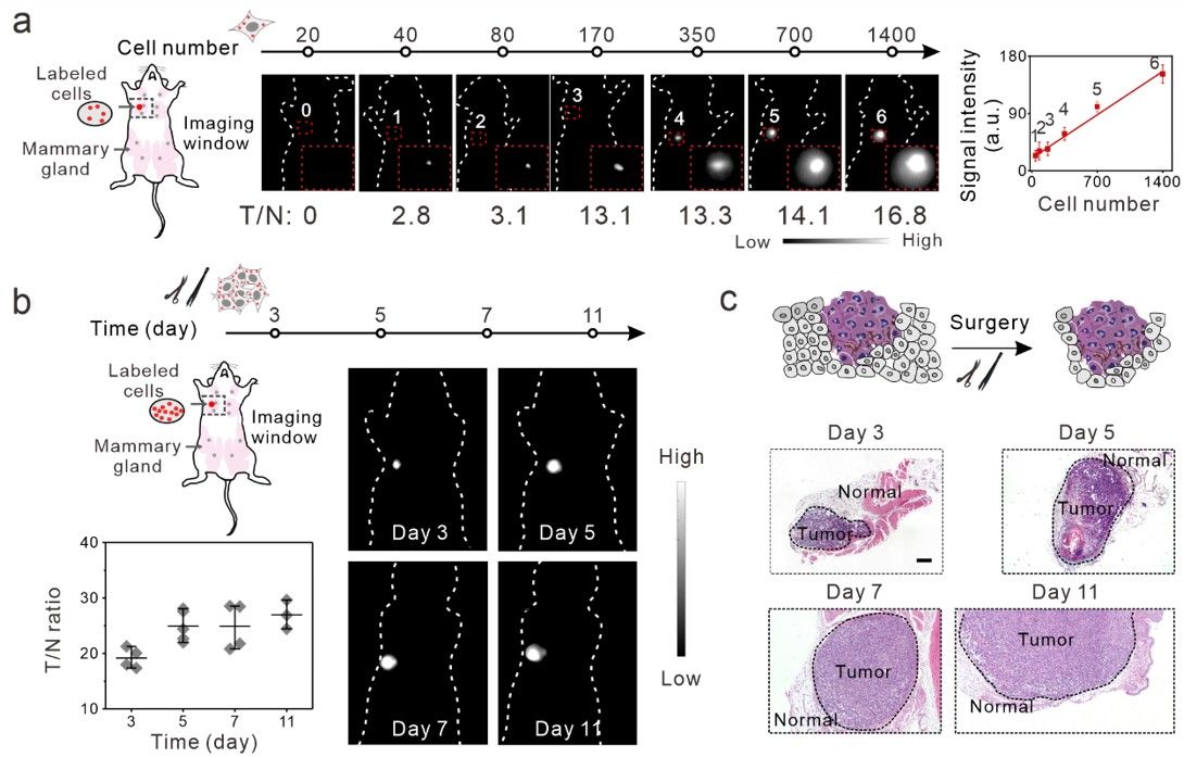 恶性肿瘤易产生侵袭性微转移,对早期诊断和手术治疗带来了巨大的挑战。目前的成像探针难以同时兼顾高灵敏度、深部组织穿透性和组织特异性。NIR-II的荧光成像显示出更好的组织穿透性、低背景自发荧光和最小的光子散射,具有很高的信噪比,在体内成像和图像引导手术中显示出巨大的前景。然而,目前尚缺乏设计NIR-II探针的通用途径,可同时满足超高灵敏度、深组织穿透性和组织特异性的要求。